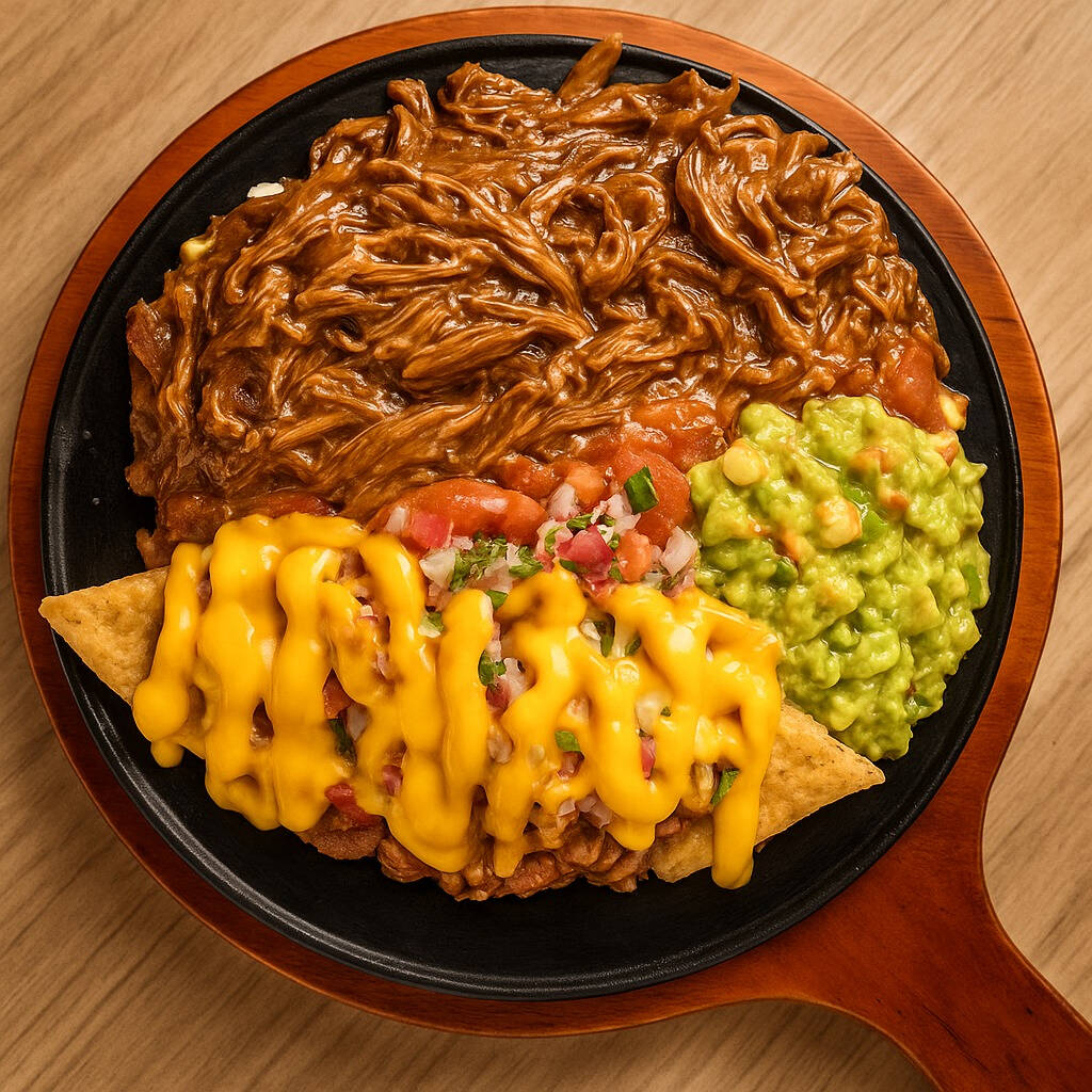 salchicha americana, papa francesa rustica, topping de carne desmechada, nachos, guacamole, pico de gallo, salsa cheddar y salsas