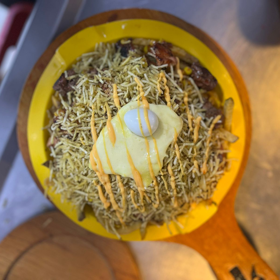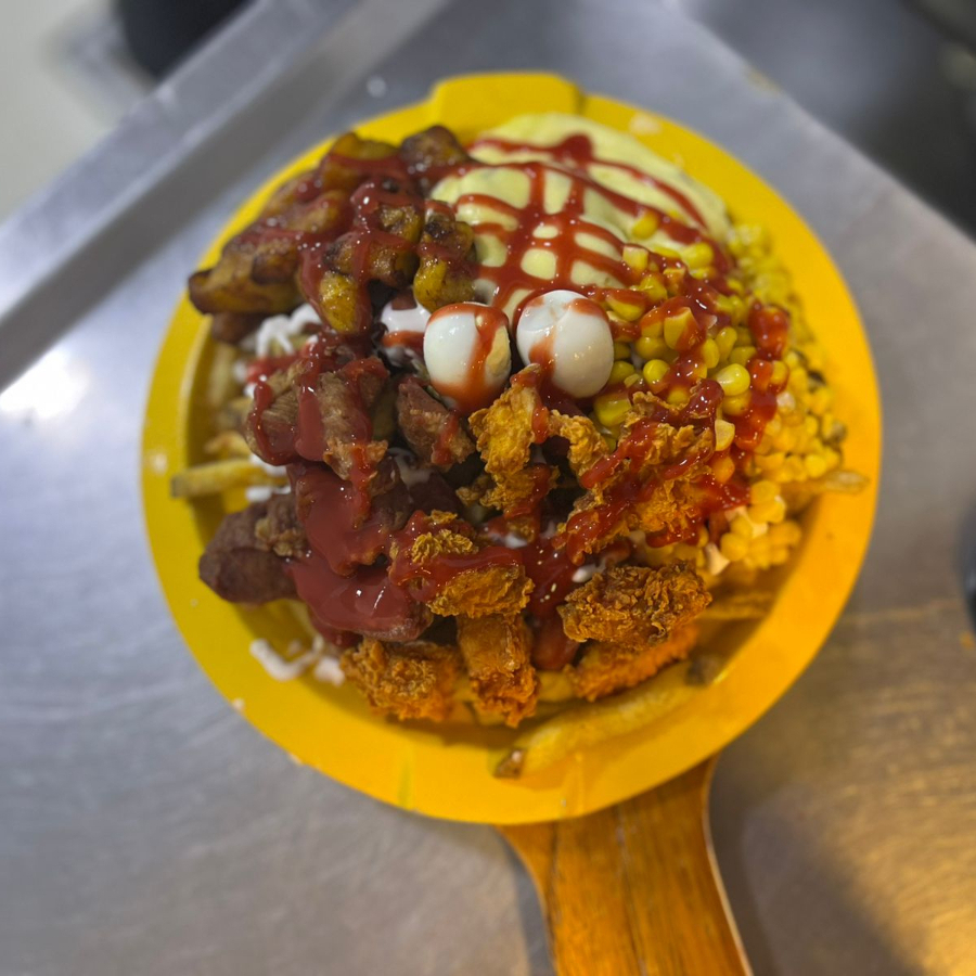 salchicha americana, papa francesa rustica, topping de chihcharron carnudo, costilla ahumada, crispetas de pollo, carne desmechada, huevo codorniz, maiz tierno, queso mozarella fundido