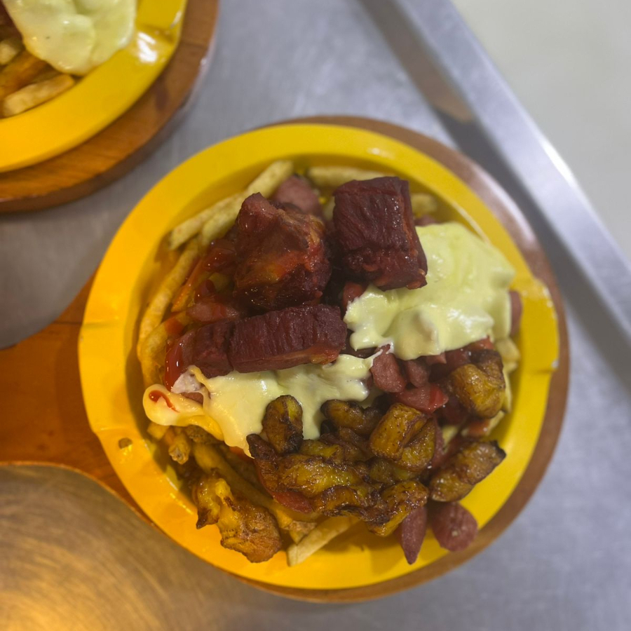 salchicha americana, papa francesa rustica, topping de tocineta, maduro, chorizo, queso mozarella fundido y salsas