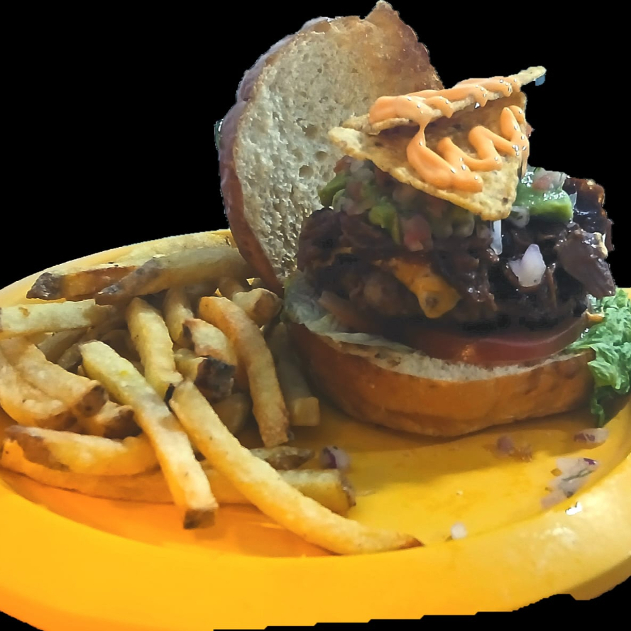 pan brioche, carne artesanal 100% res, nachos, pico de gallo, carne desmechada, guacamole