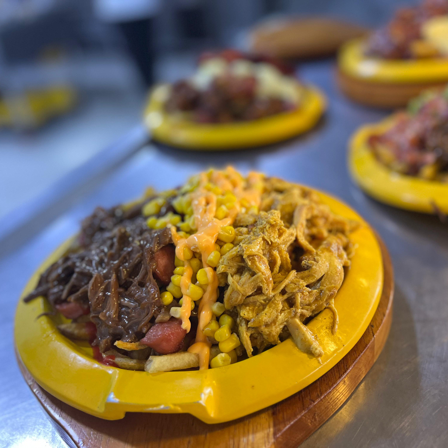 Carne desmechada, papa ripio, pollo desmechado, salchicha, queso fundido y salsa