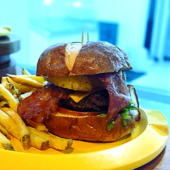 Pan brioche, carne artesanal 100% res, tocineta, tomate, lechuga, piña caramelizada y salsa