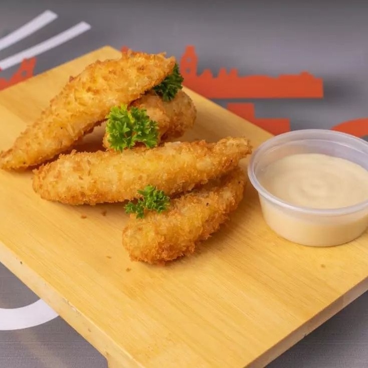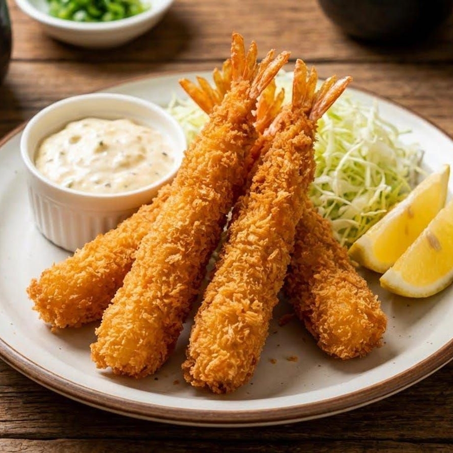 5 langostinos apanados en salsa especial.