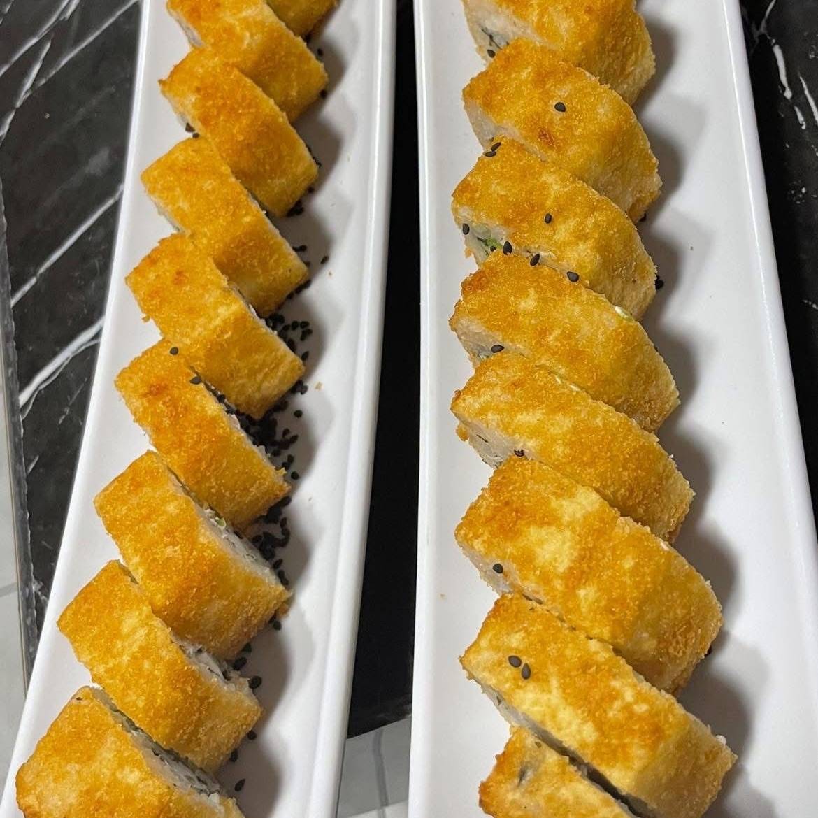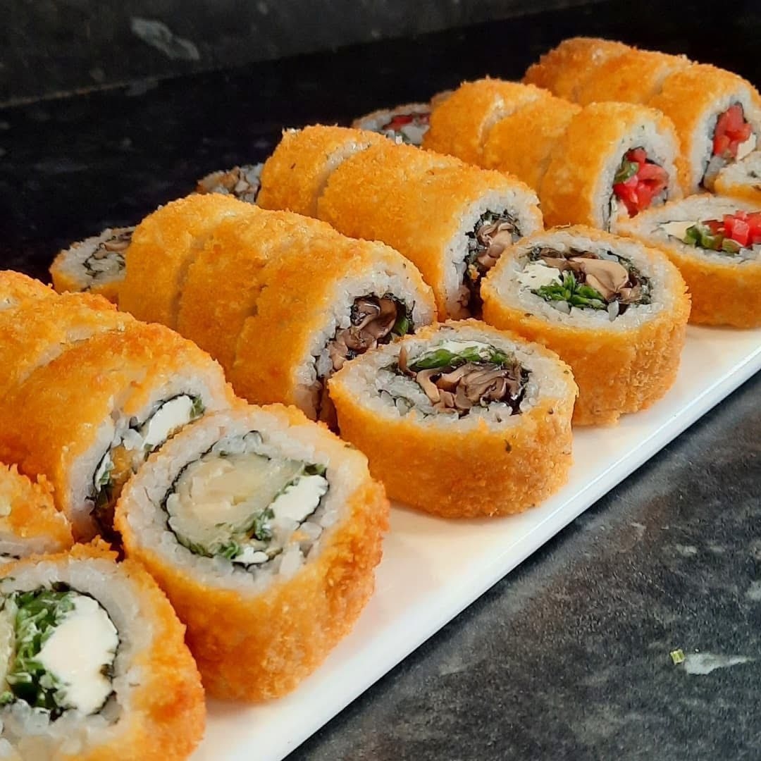 Roll de sushi totalmente tempura, relleno de tilapia y queso crema.