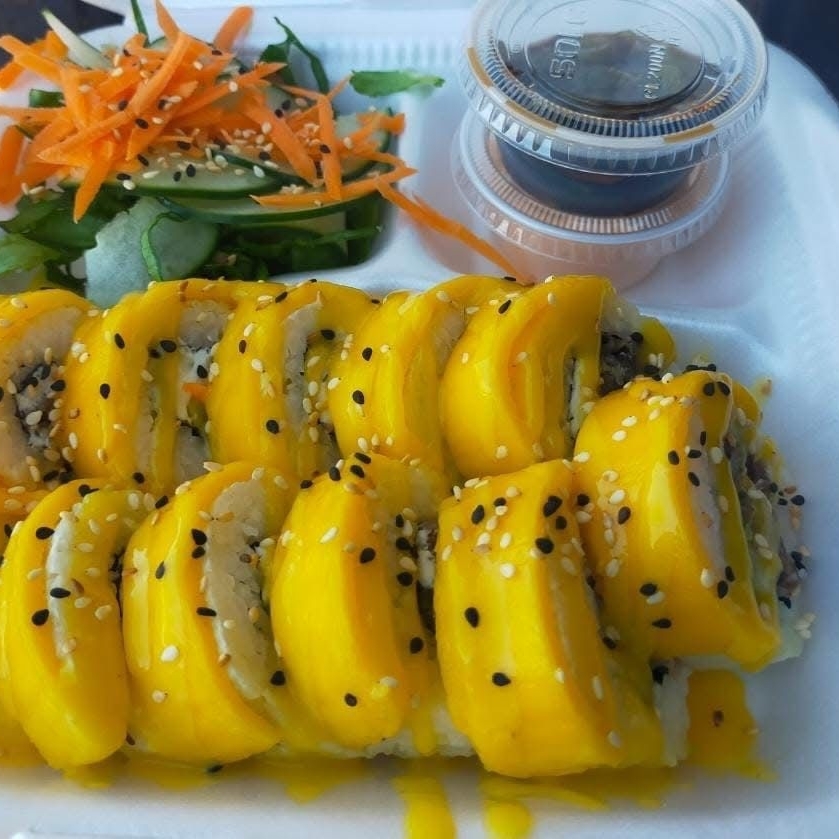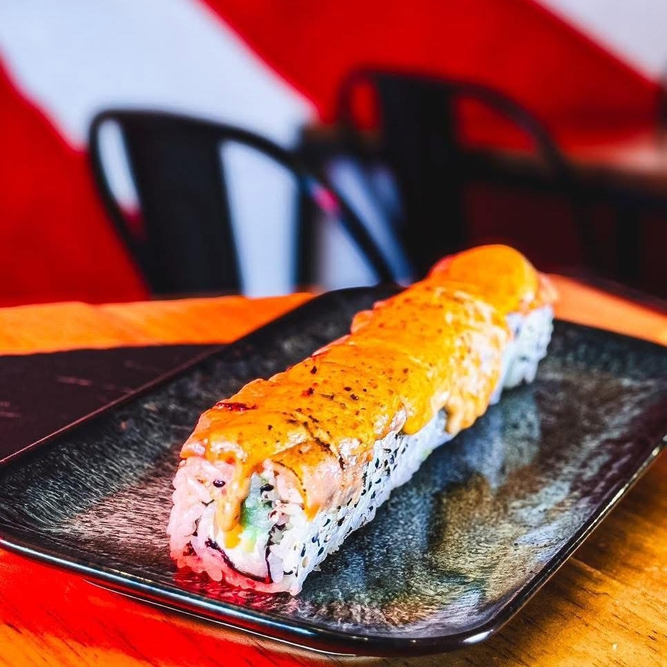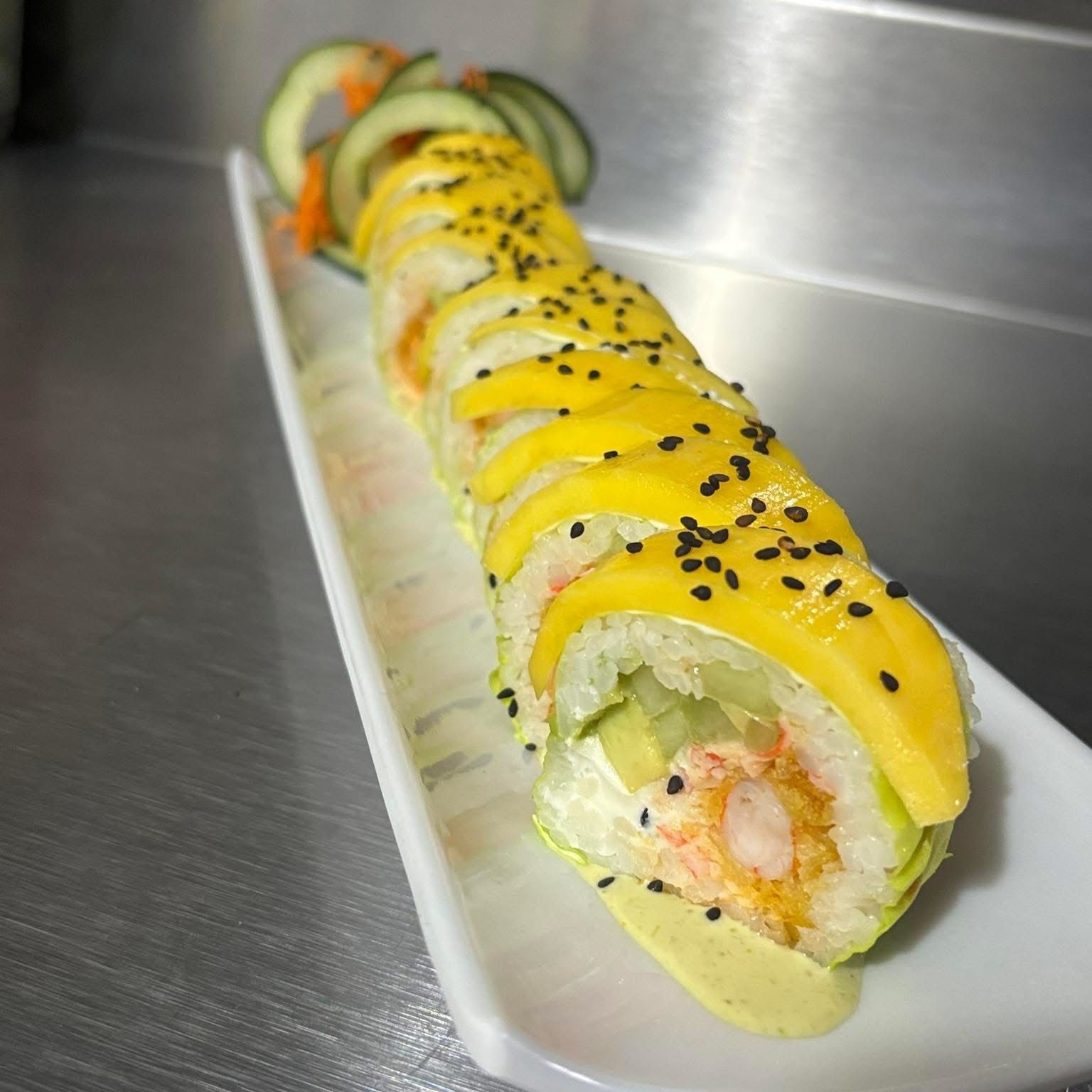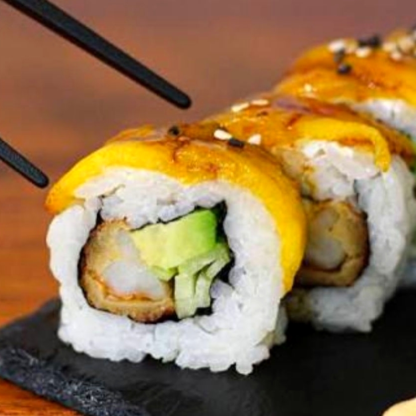 Roll de camaron tempura con aguacate y queso crema, con topping de mango picante y mayonesa spicy.