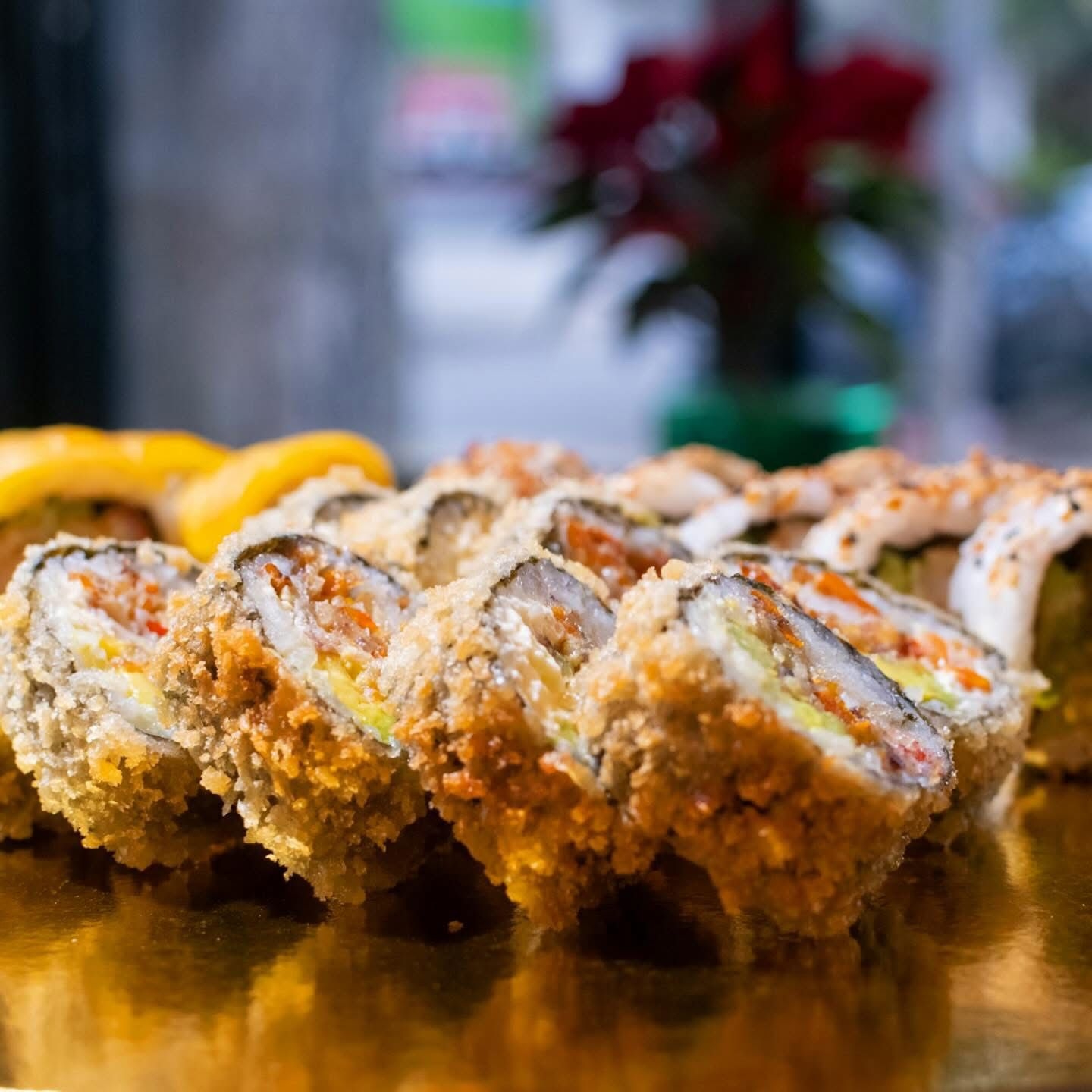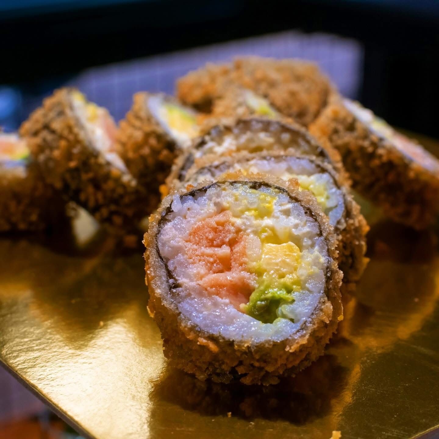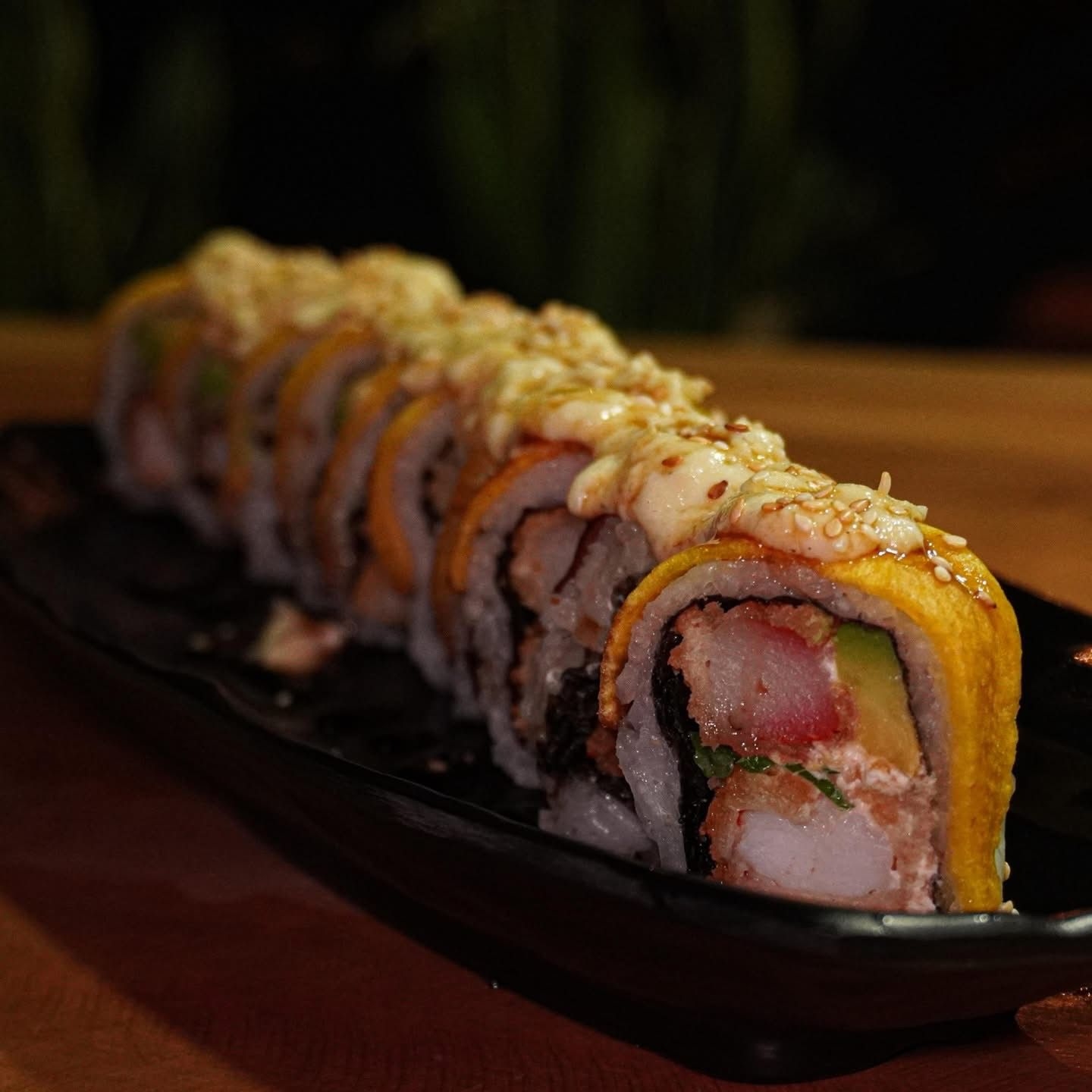 Roll relleno de salmón tempura, palmito de cangrejo, aguacate, queso crema y topping de plátano maduro.