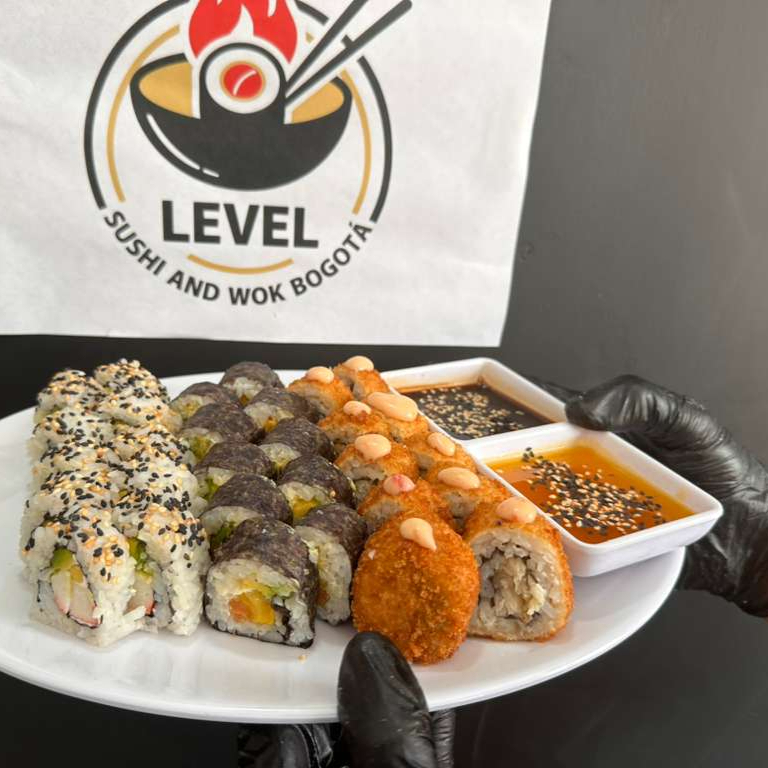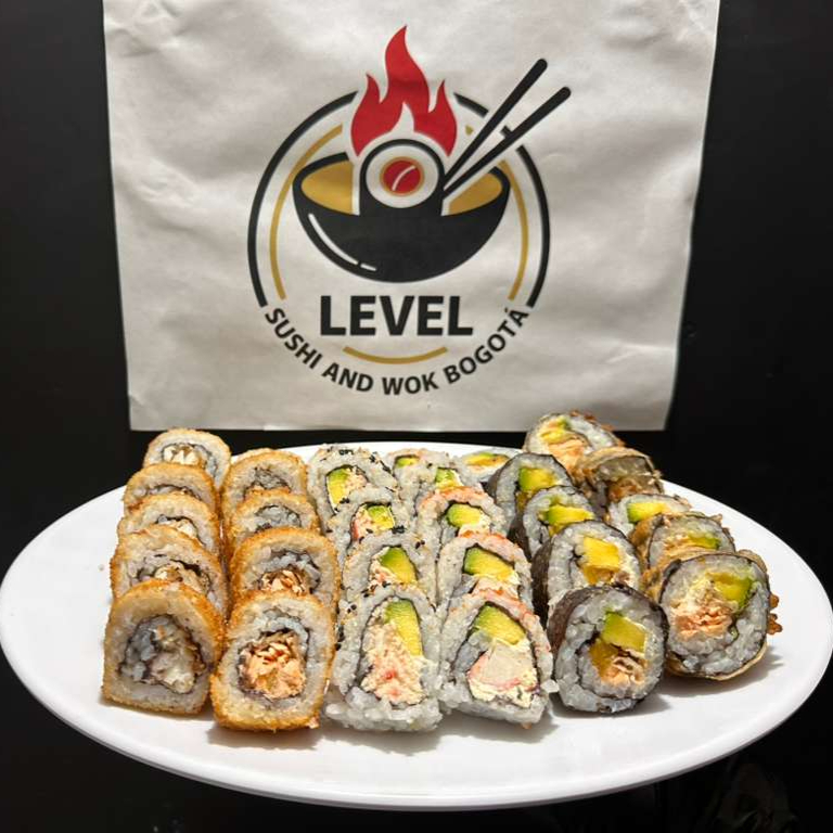 20 bocados de 4 sabores (5 pasion level, 5 hot atun, 5 philadelphia y 5 philadelphia tempura) + 2 gaseosas postbox 250ml