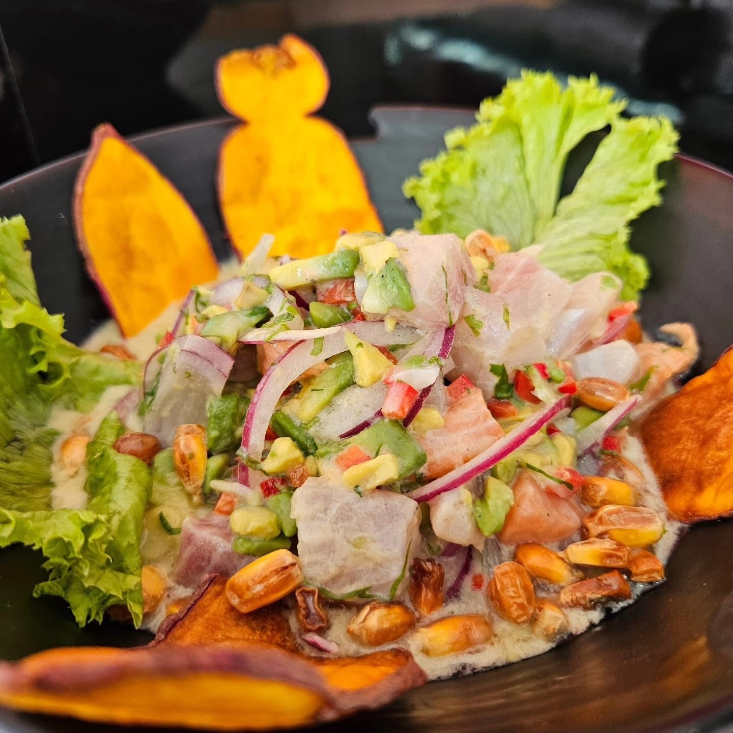 Salmon, atun, tilapia y camarones, cebolla, sal, limon, ajinomoto, cilantro y leche de tigre.