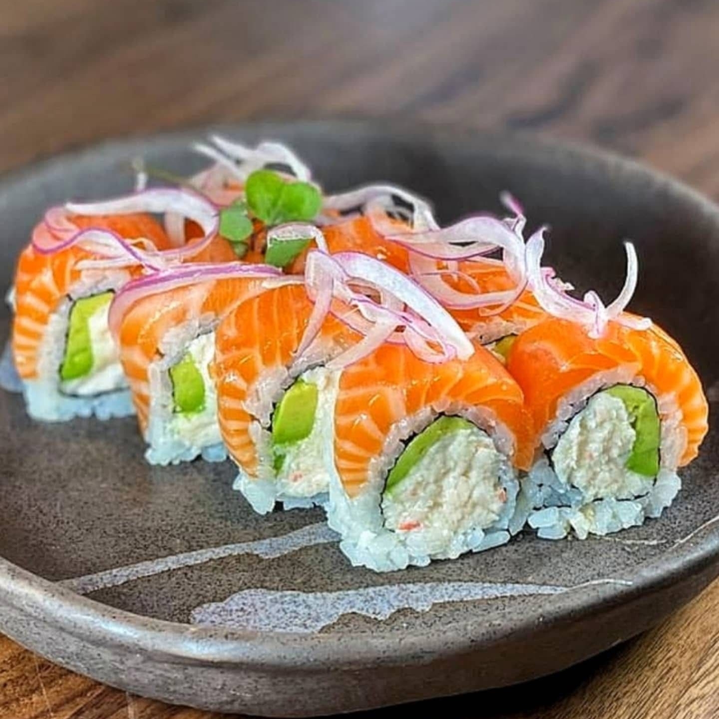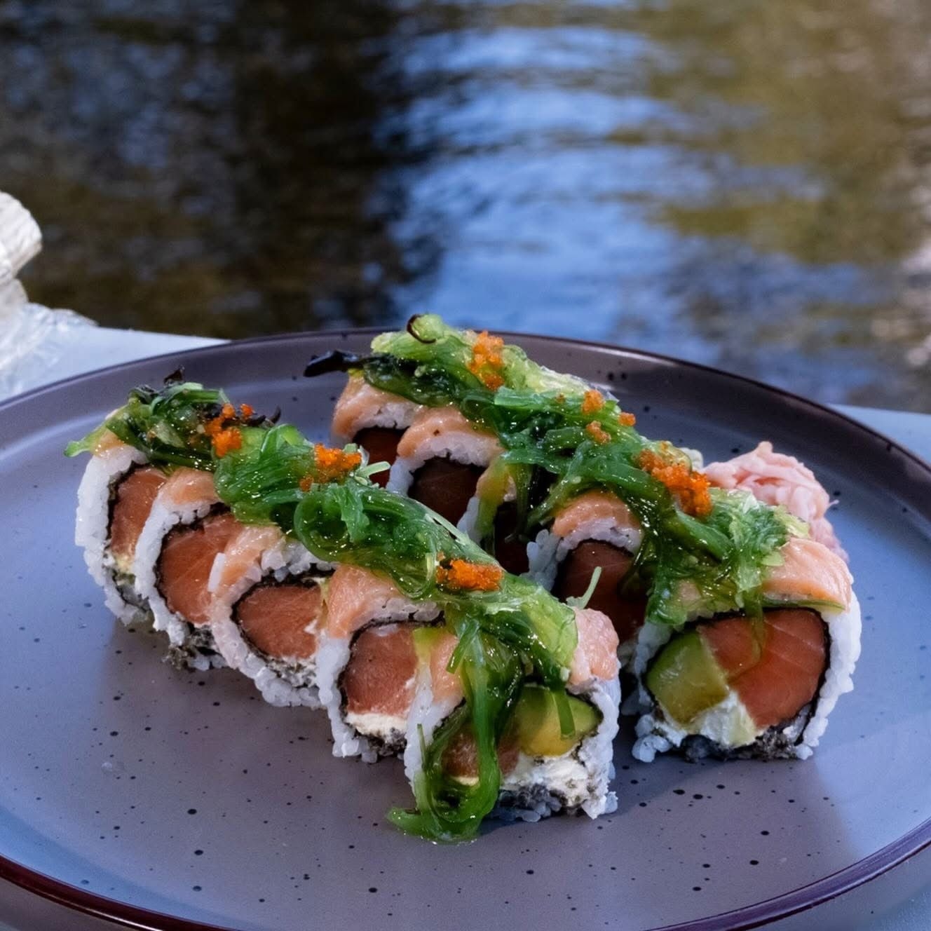 Roll relleno de salmon, queso crema, aguacate, cubierto de alga totalmente temporizado.