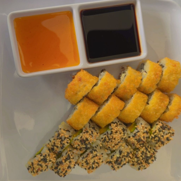 Roll relleno de cangrejo, aguacate y queso crema totalmente apanado. incluye: palillos chinos, una salsa de soya y una salsa de su elección.