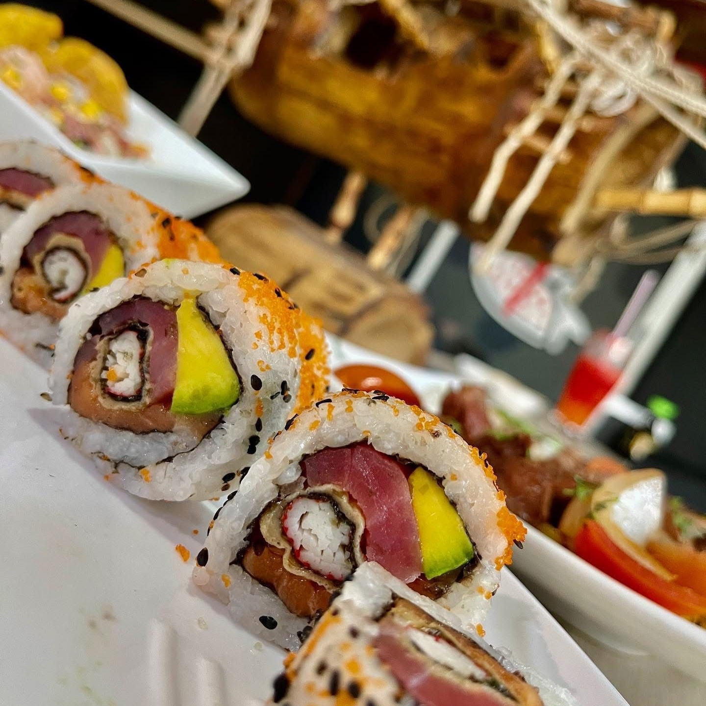 Roll delicadamente flameado, con langostinos crocantes y crema de aguacate, topping con láminas de salmón sopleteadas con teriyaki y un hilo de arrachaca a la paprika.