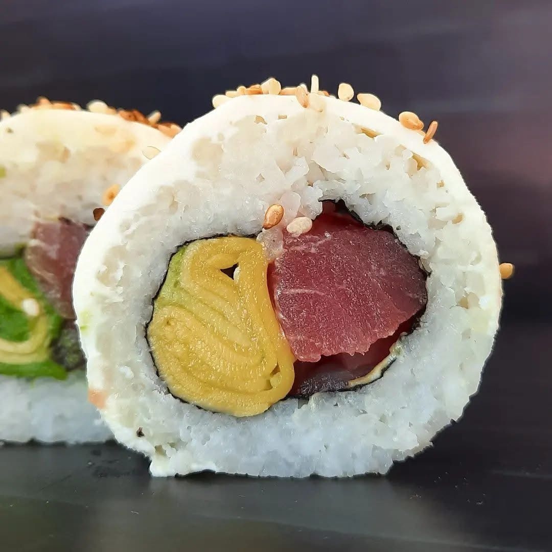 Roll relleno de atun, aguacate, queso crema con topping de ajonjoli.