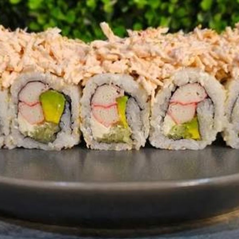 Roll relleno de pescado blanco, cangrejo, aguacate, queso crema con topping de salmon.