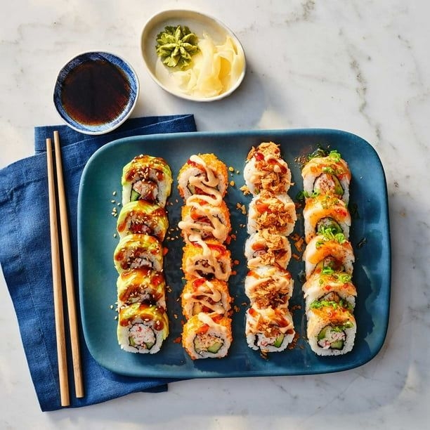 10 rollos california, 10 salmon skin, 10 apanado, salsa soya , salsa teriyaki , palitos chinos