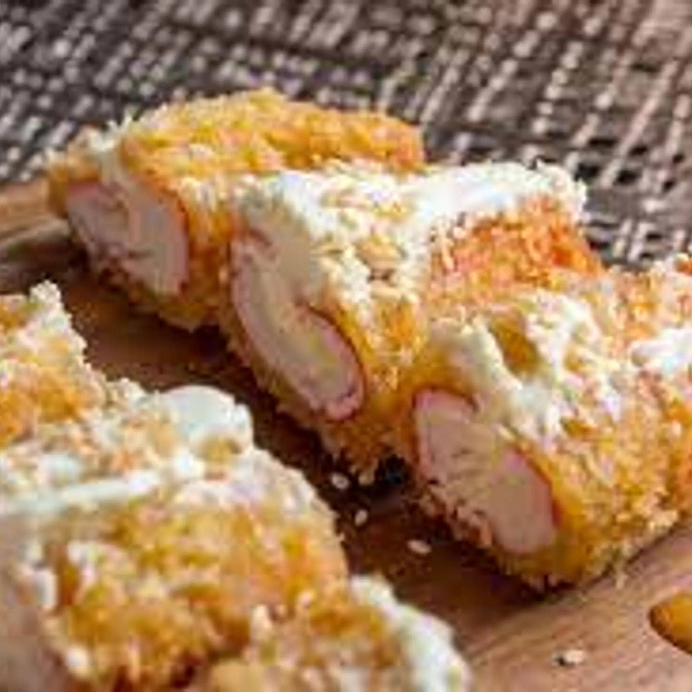 Roll relleno de palmito de cangrejo, queso crema, aguacate con topping de masago, ajonjolí rebozado con camarones.