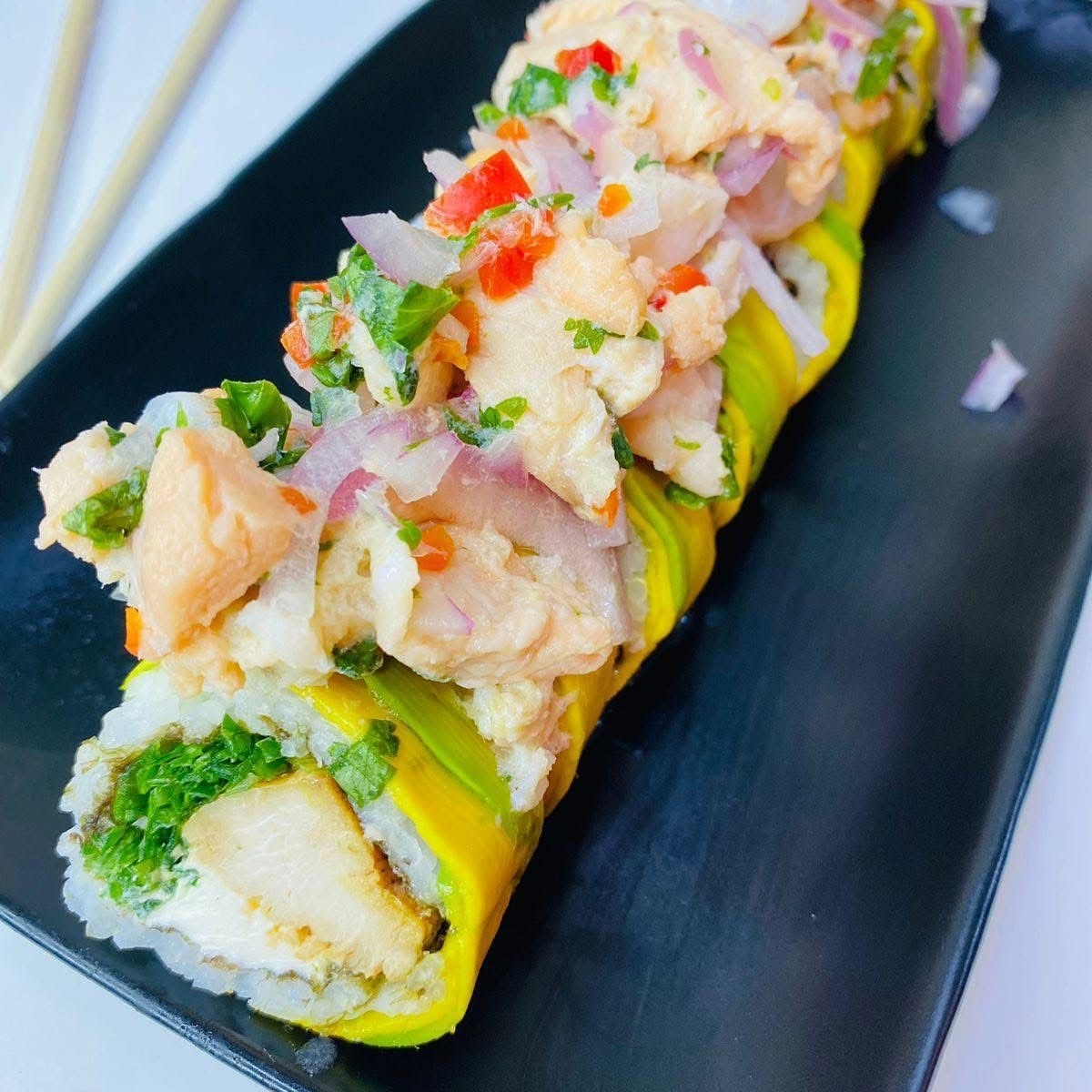 Roll relleno de atún, aguacate, queso crema con topping de ajonjolí, cebollín y salsa picante.
