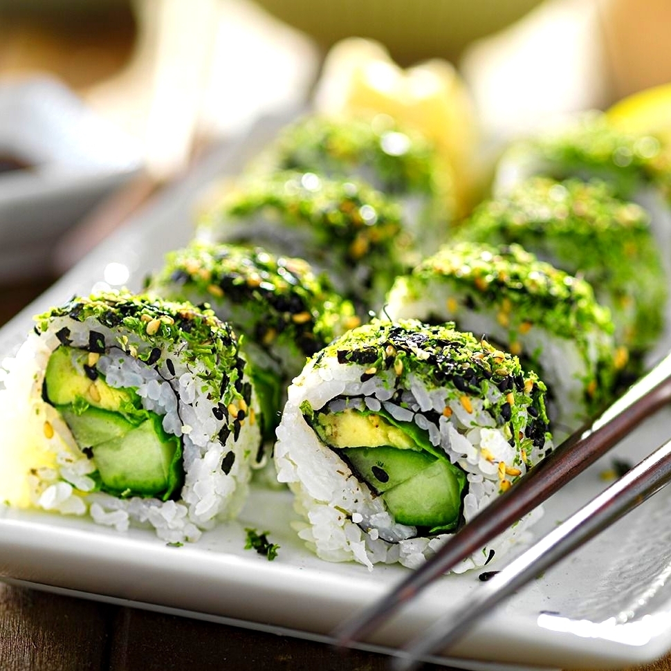 Roll fresco con aguacate, pepino y zanahoria, envuelto en arroz y alga nori, ligero y saludable