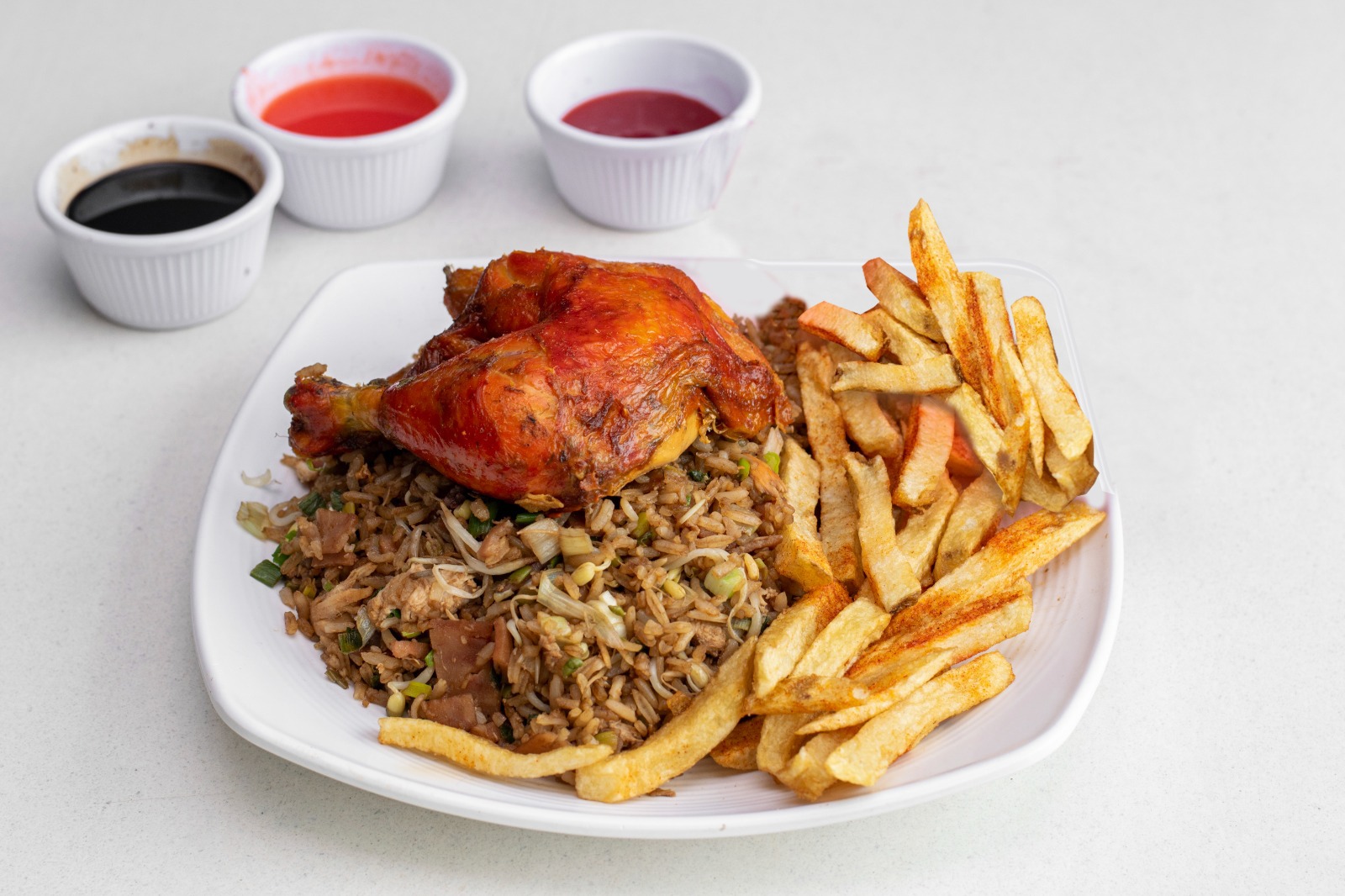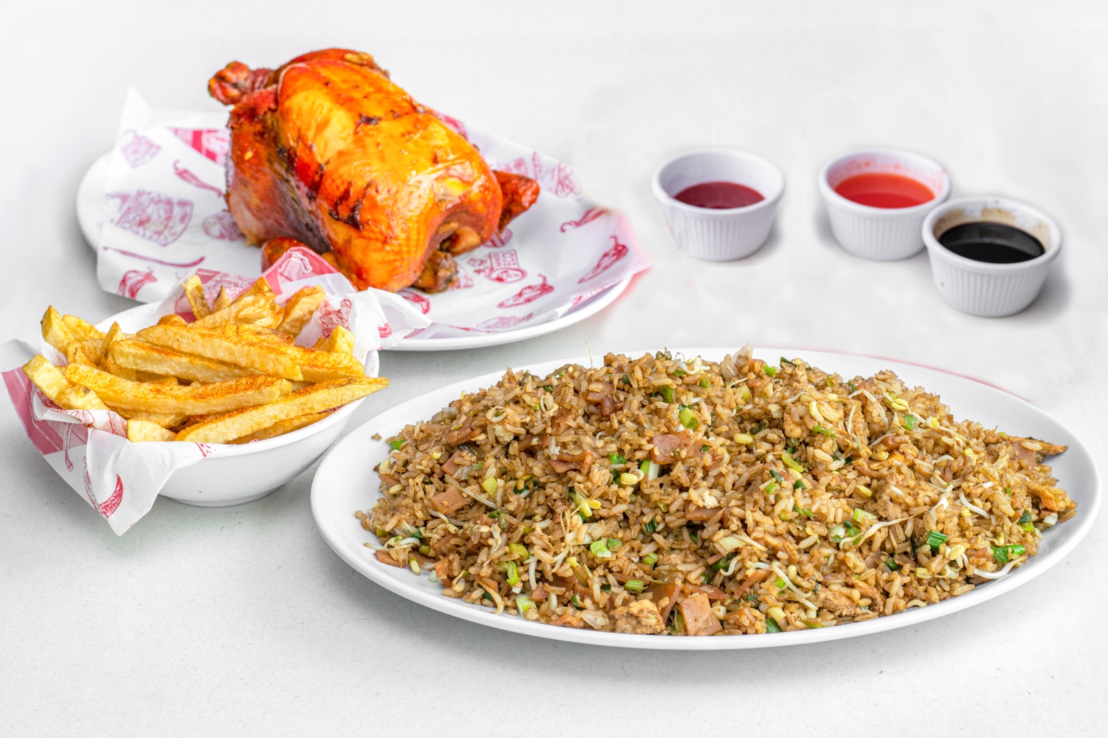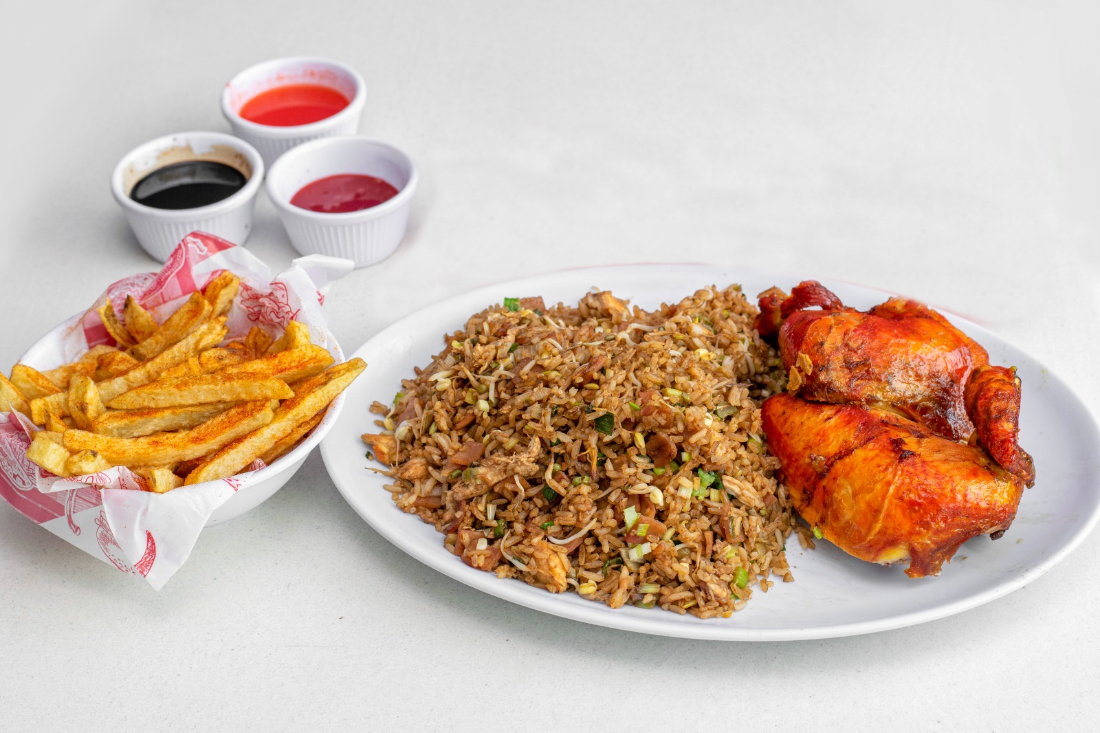 Lleva un arroz oriental mediano (jamón ahumado, tocineta, cebollín y pollo desmechado), acompañado de medio pollo asado o broaster, porción de papa a la francesa
