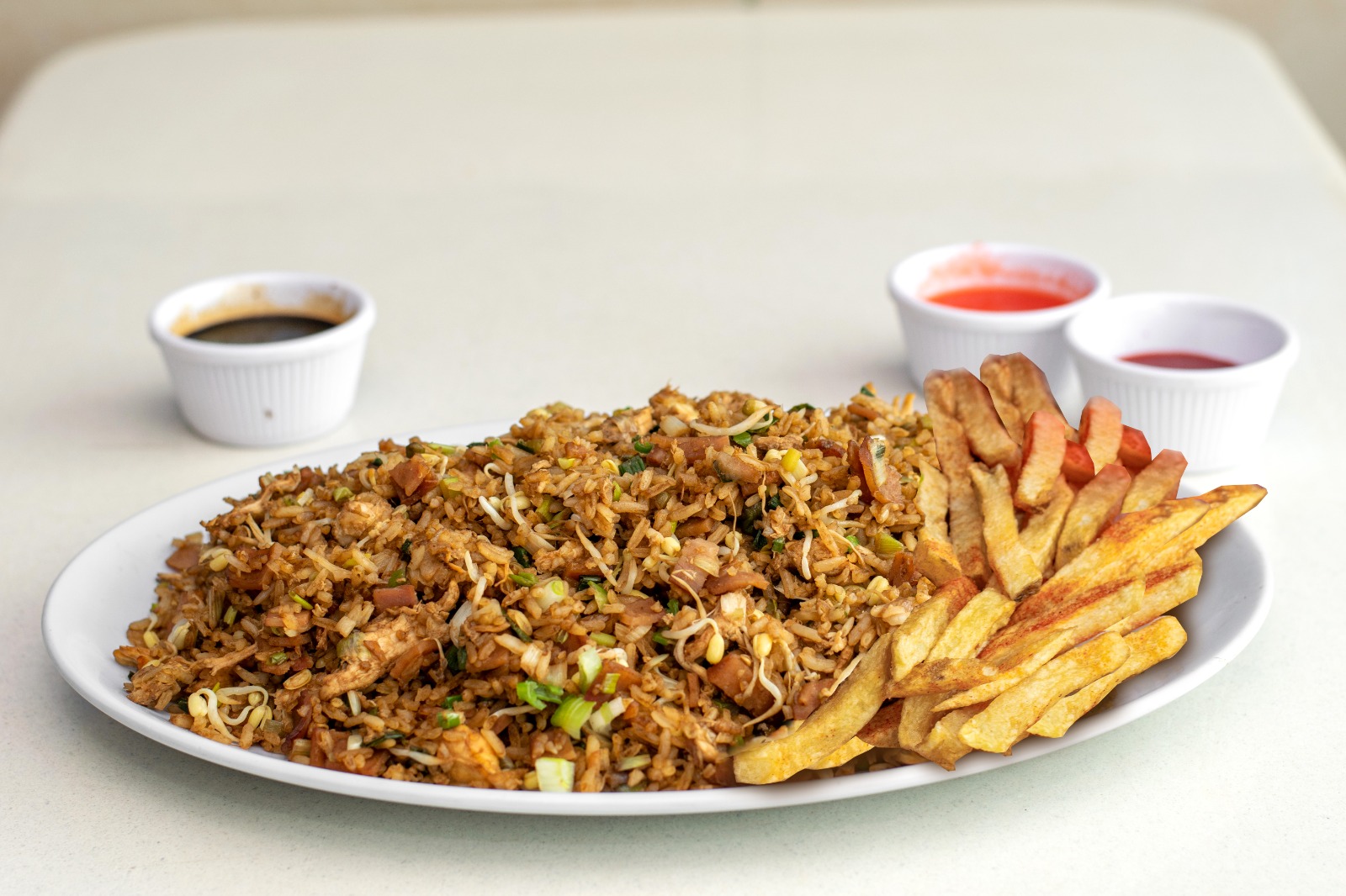 Lleva un arroz oriental personal (jamón ahumado, tocineta, cebollín y pollo desmechado) acompañado de porción de papas a la francesa.