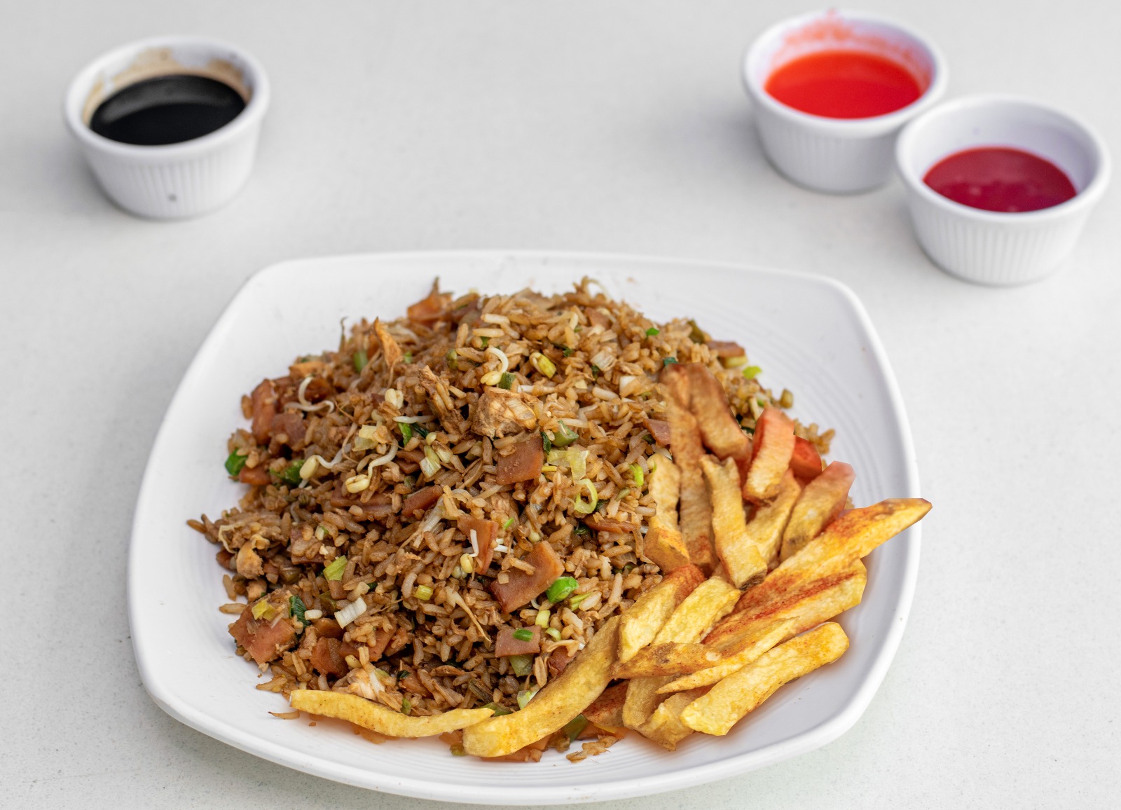 Lleva un arroz oriental personal (jamón ahumado, tocineta, cebollín y pollo desmechado) acompañado de papas a la francesa.