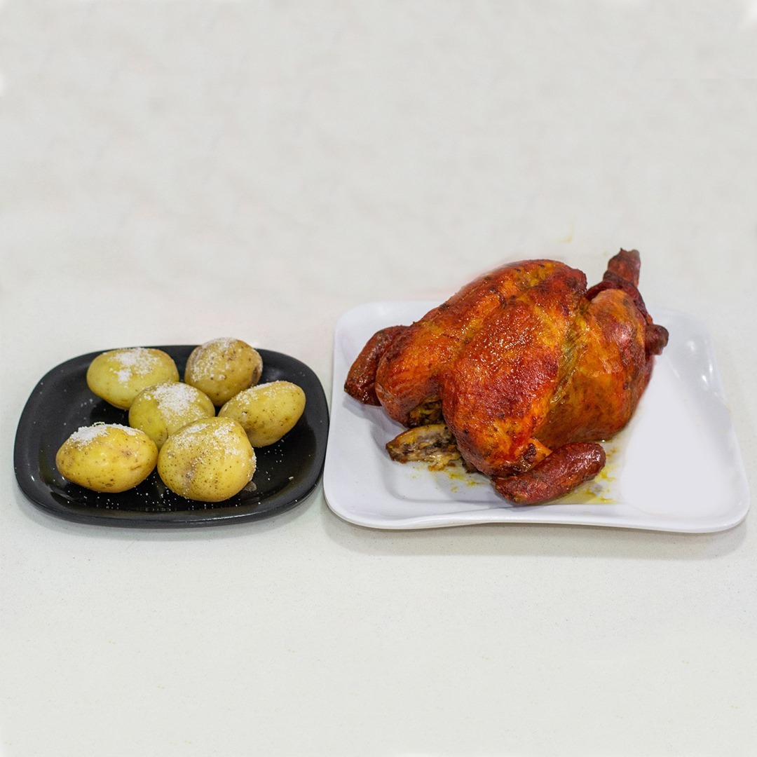 Un pollo asado, 6 papas saladas, gaseosas 1 litro Postobón a disponibilidad de la tienda