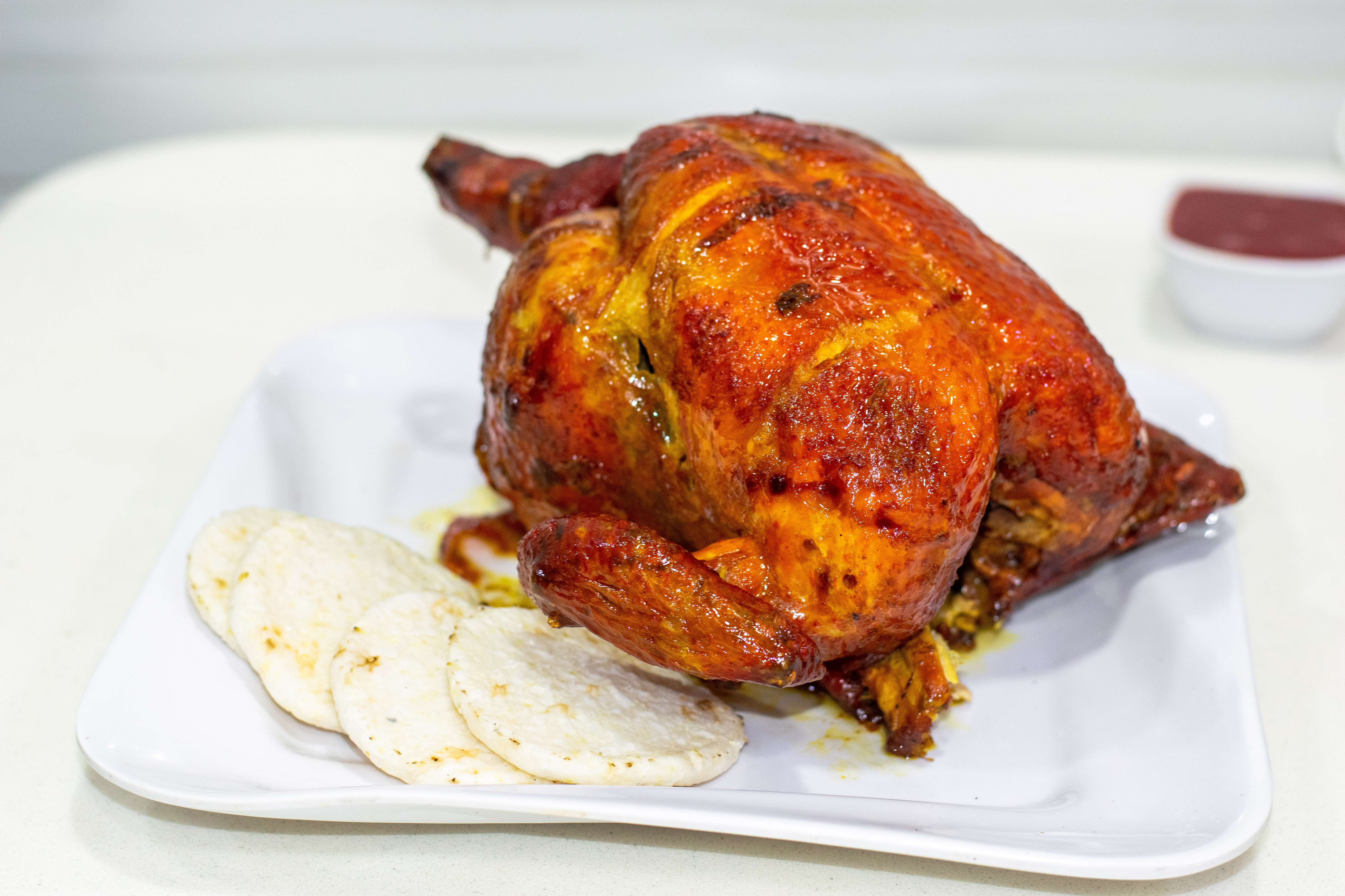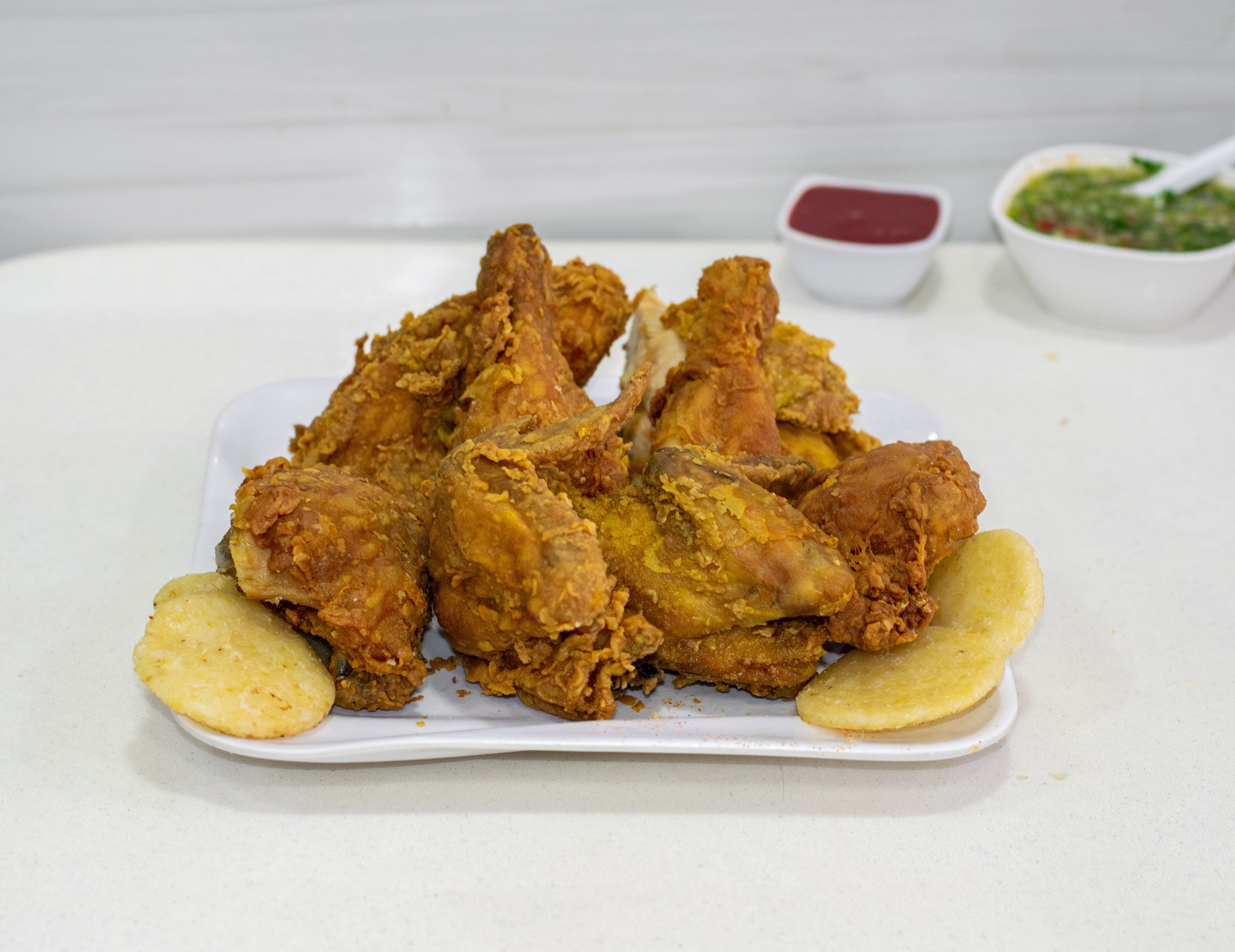 8 Presas de pollo broaster (1,200 gramos) y arepa.