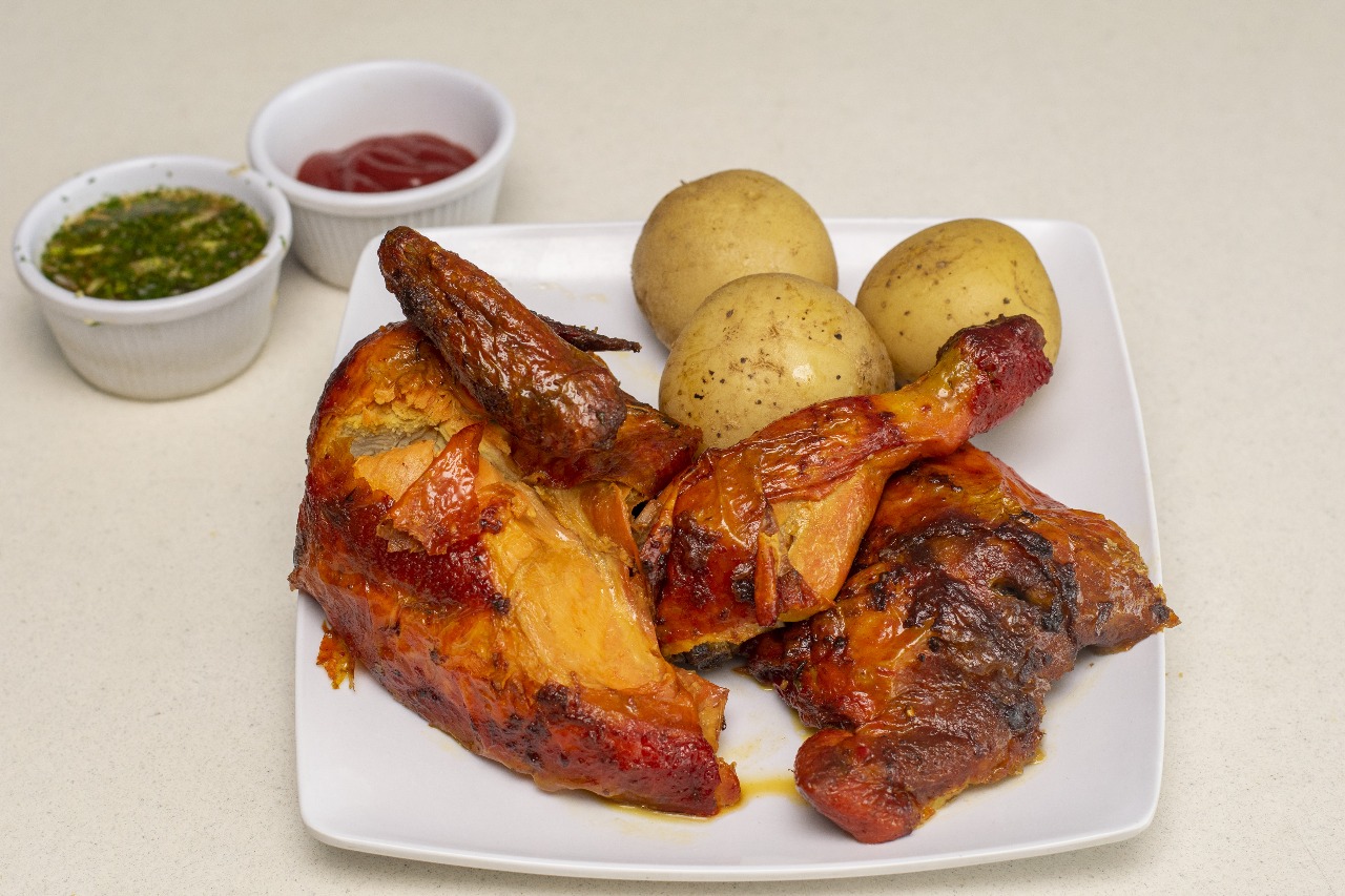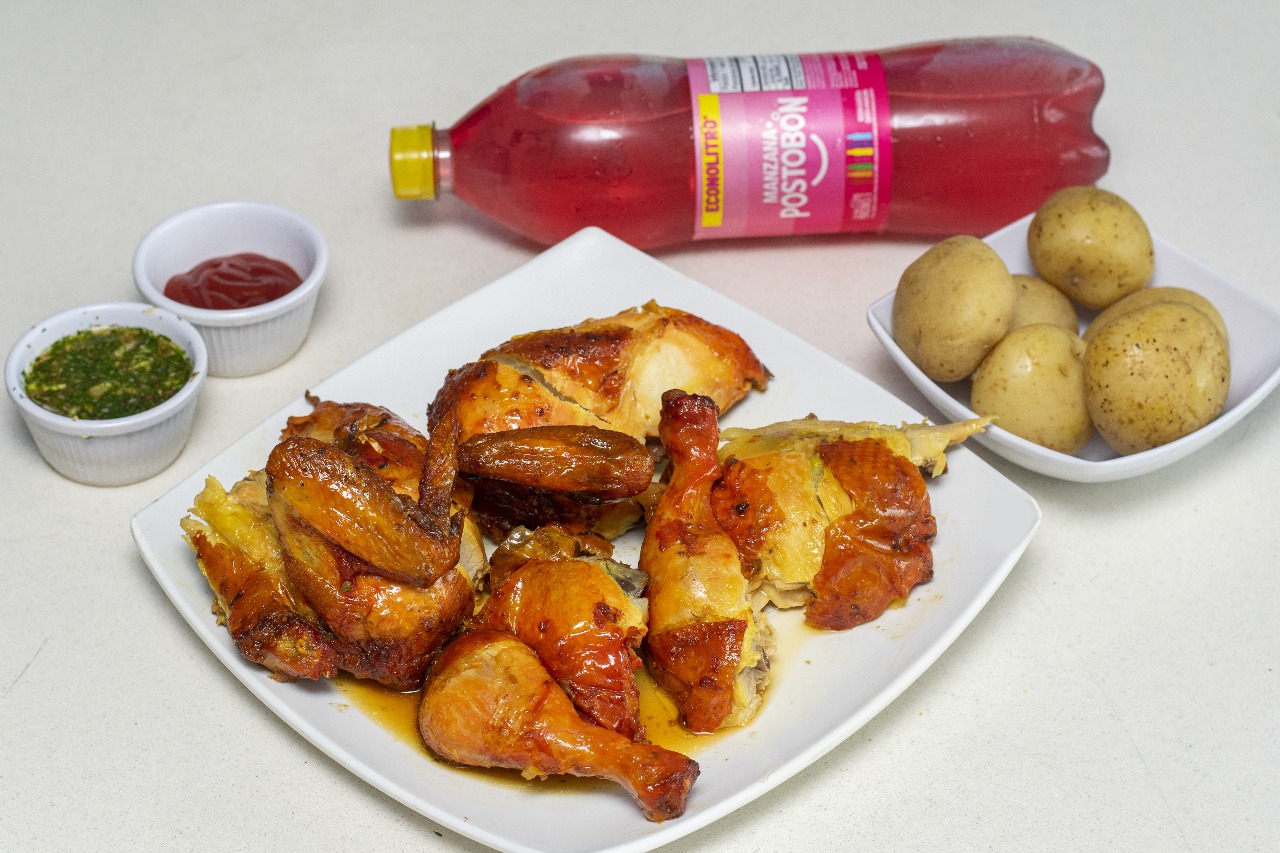 Un pollo asado, 6 papas saladas, gaseosas 1 litro Postobón a disponibilidad de la tienda