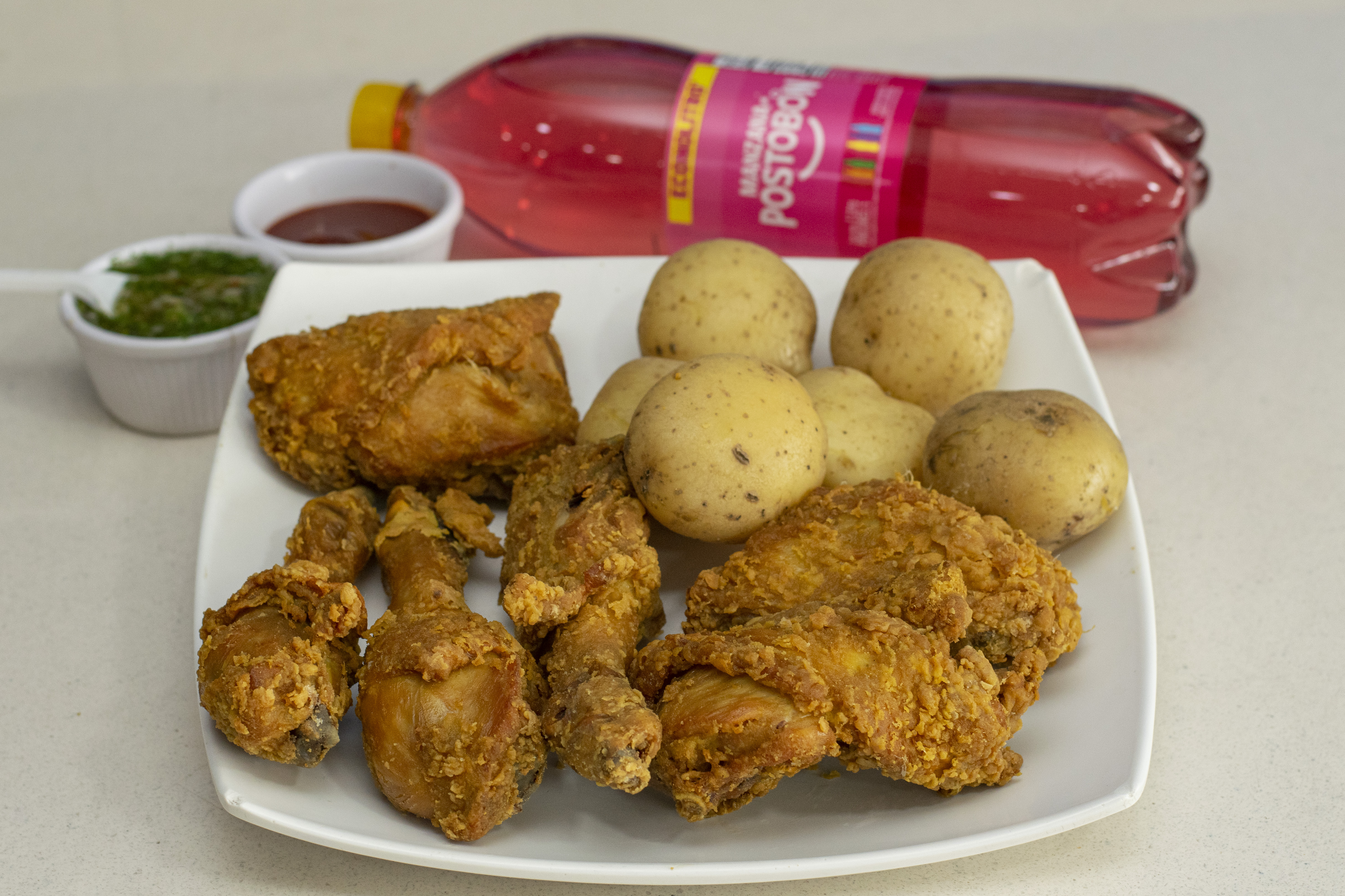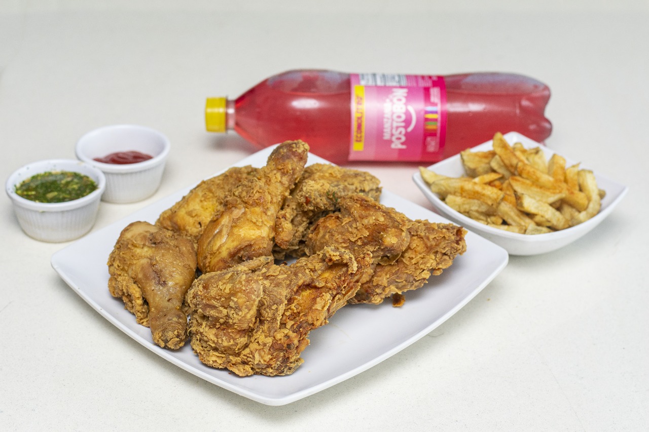 1 pollo broaster acompañado de papa francesa artesanal, gaseosa 1 litro Postobón a disponibilidad del restaurante.