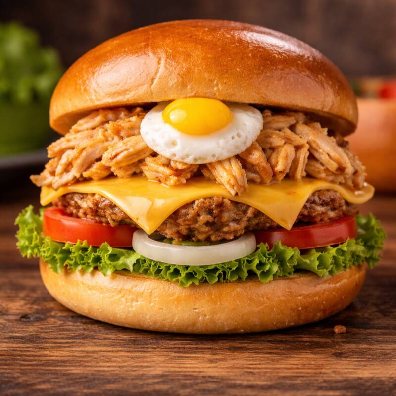 Hamburguesa en pan brioche suave y esponjoso, con carne jugosa y pollo desmechado, acompañada de queso tajado derretido y huevo de codorniz. Con tomate fresco, lechuga crujiente y cebolla que le dan el balance perfecto 🤤.