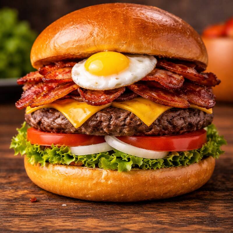 Potente hamburguesa en pan brioche suave y esponjoso, con doble carne jugosa, queso tajado derretido y doble tocineta crocante 🤤. Coronada con huevo criollo y acompañada de lechuga fresca, tomate y cebolla para el balance perfecto.
