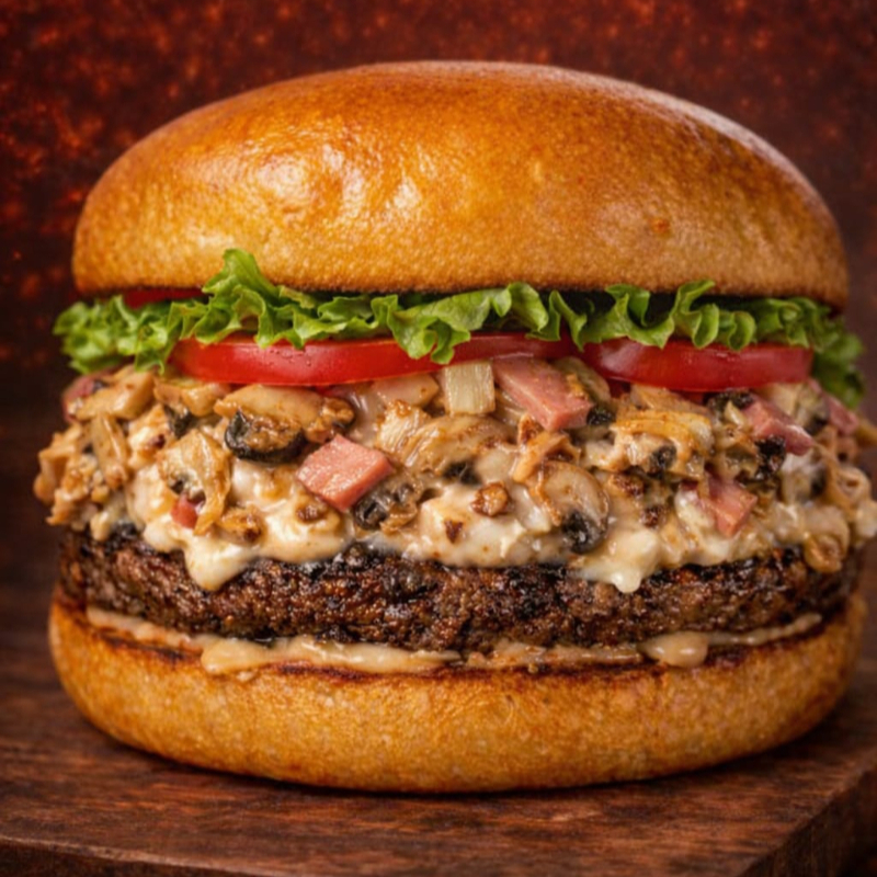 Hamburguesa en pan brioche suave y esponjoso, con carne jugosa, jamón y queso tajado derretido. Acompañada de una deliciosa mezcla de pollo con champiñones que le da un sabor cremoso y único 🤤. Con tomate fresco, lechuga crujiente y cebolla para el balance perfecto.