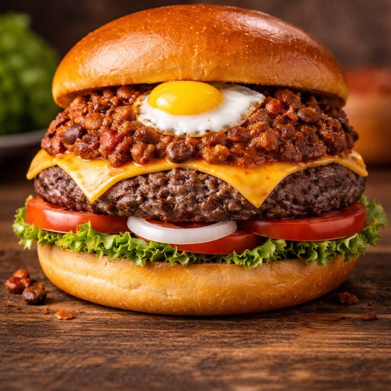 Hamburguesa en pan brioche suave y esponjoso, con carne jugosa, queso tajado derretido y un delicioso topping de chile con carne que la hace única 🤤. Acompañada de huevo criollo, tomate, cebolla fresca y lechuga crujiente para el balance perfecto de sabor.