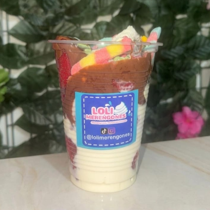 Descripción: Vaso de 13 oz con base de chips de merengue, crema de leche de la casa, 1 porción de fruta de , 2 toppings, dulces, 1 perlas explosivas, salsas a elegir, helado, barquillo
