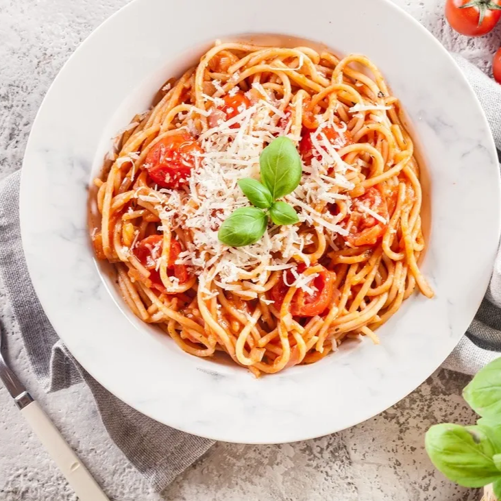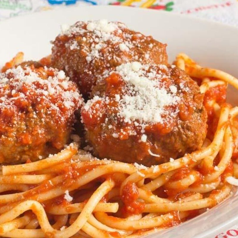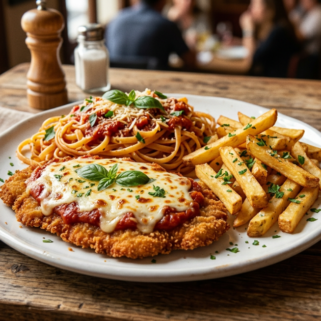 MILANESA DE POLLO CON PASTA NAPOLITANA Y PAPAS