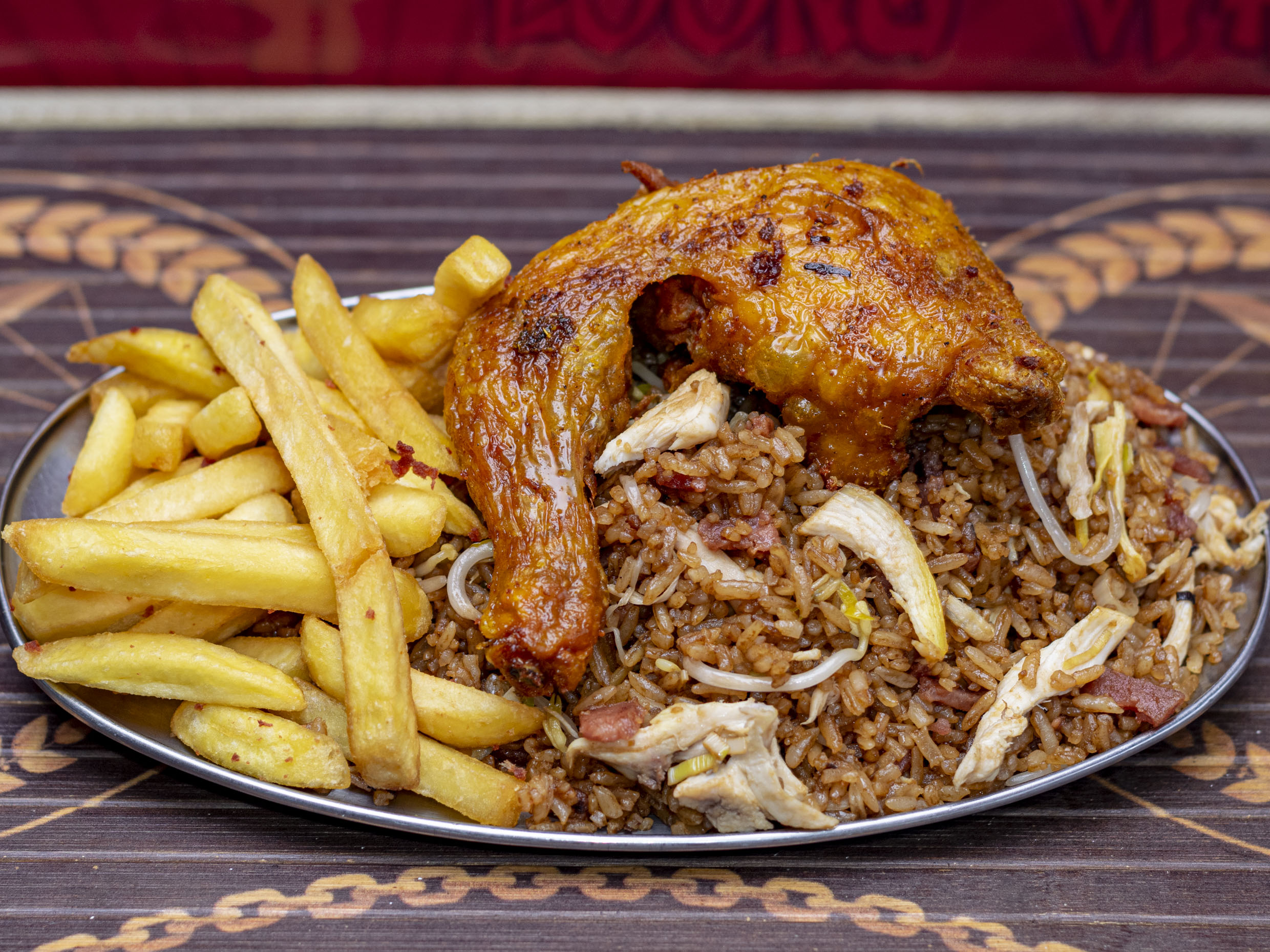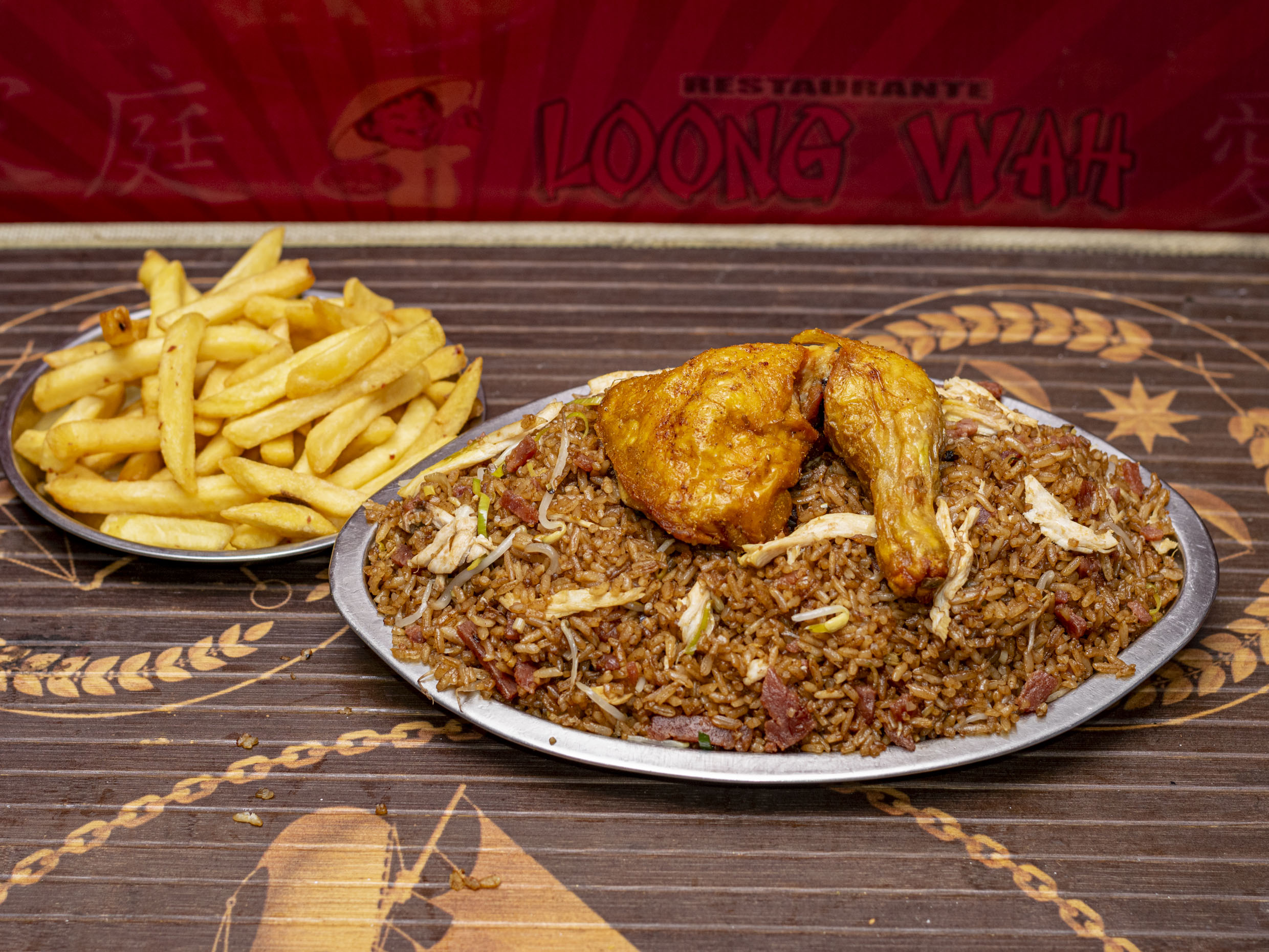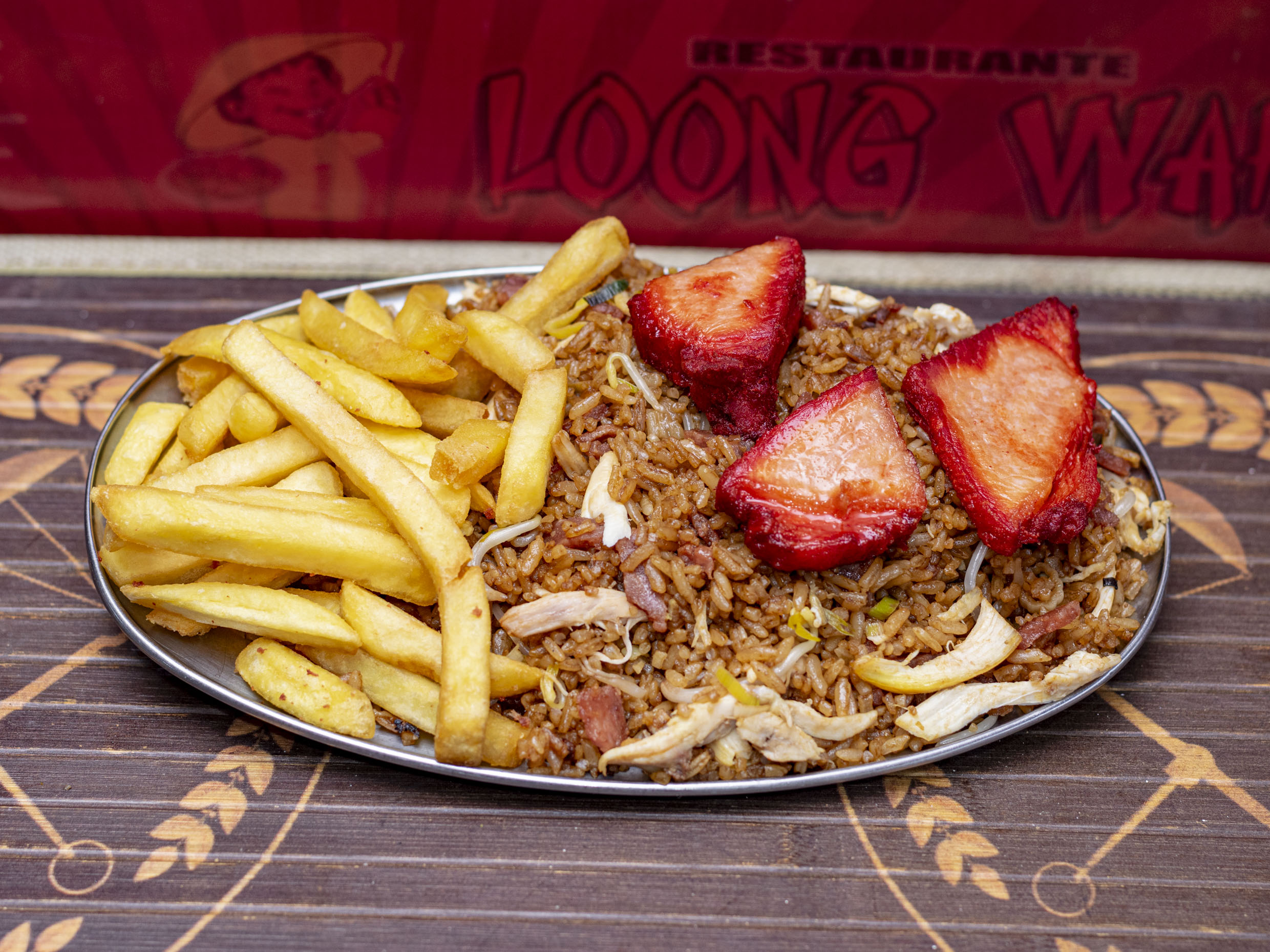1 Chow Fan Mixto( jamon raiz y pollo desmechado) +1 porcion de Papas a la Francesa(100 gramos ) + 1 Lomo de Cerdo (160 gramos ), salsa de tomate y miel