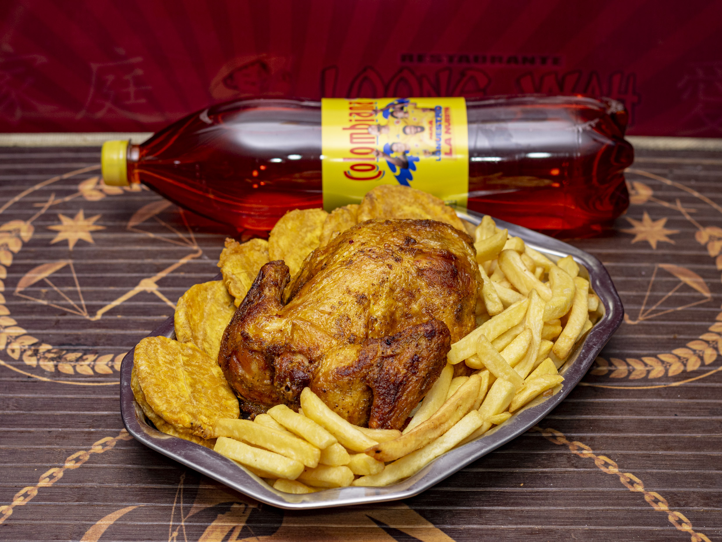 costilla, chorizo, salchicha,chicharrón, plátano maduro y maíz tierno, medio pollo frito papa francesa yuca y gaseosa 1.5