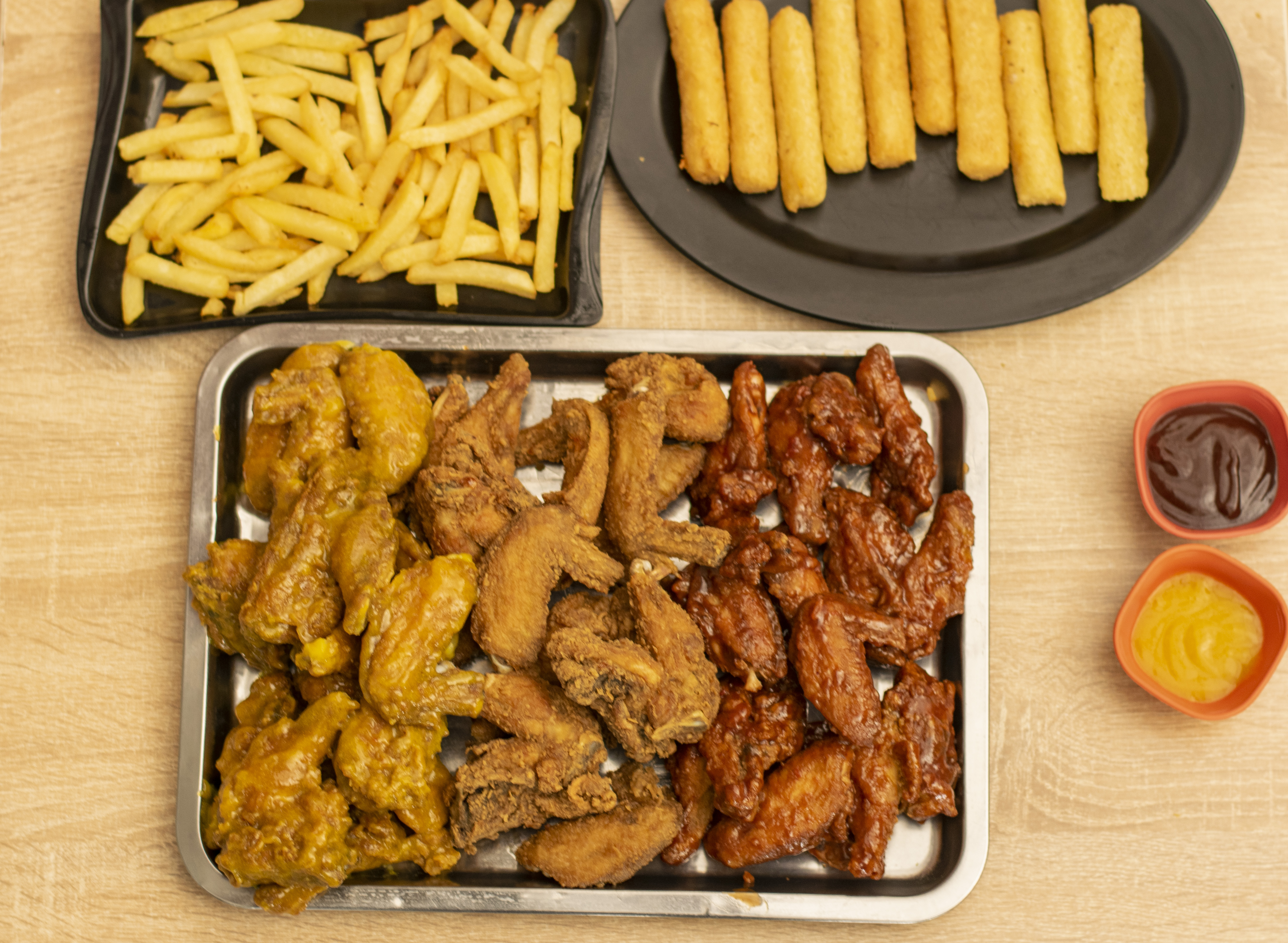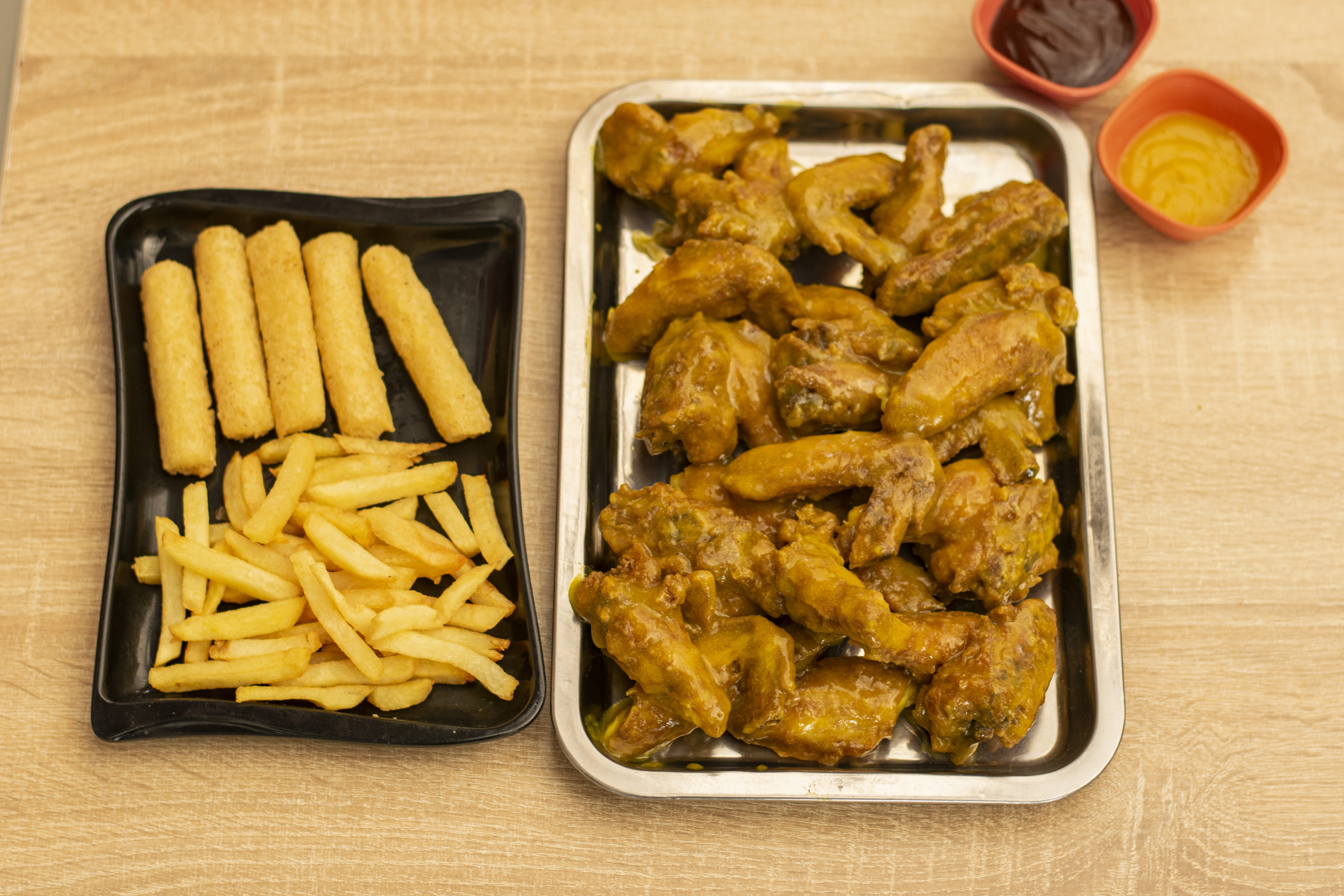 30 piezas de alitas, papa francesa 150 gramos y 5 croquetas de yuca.