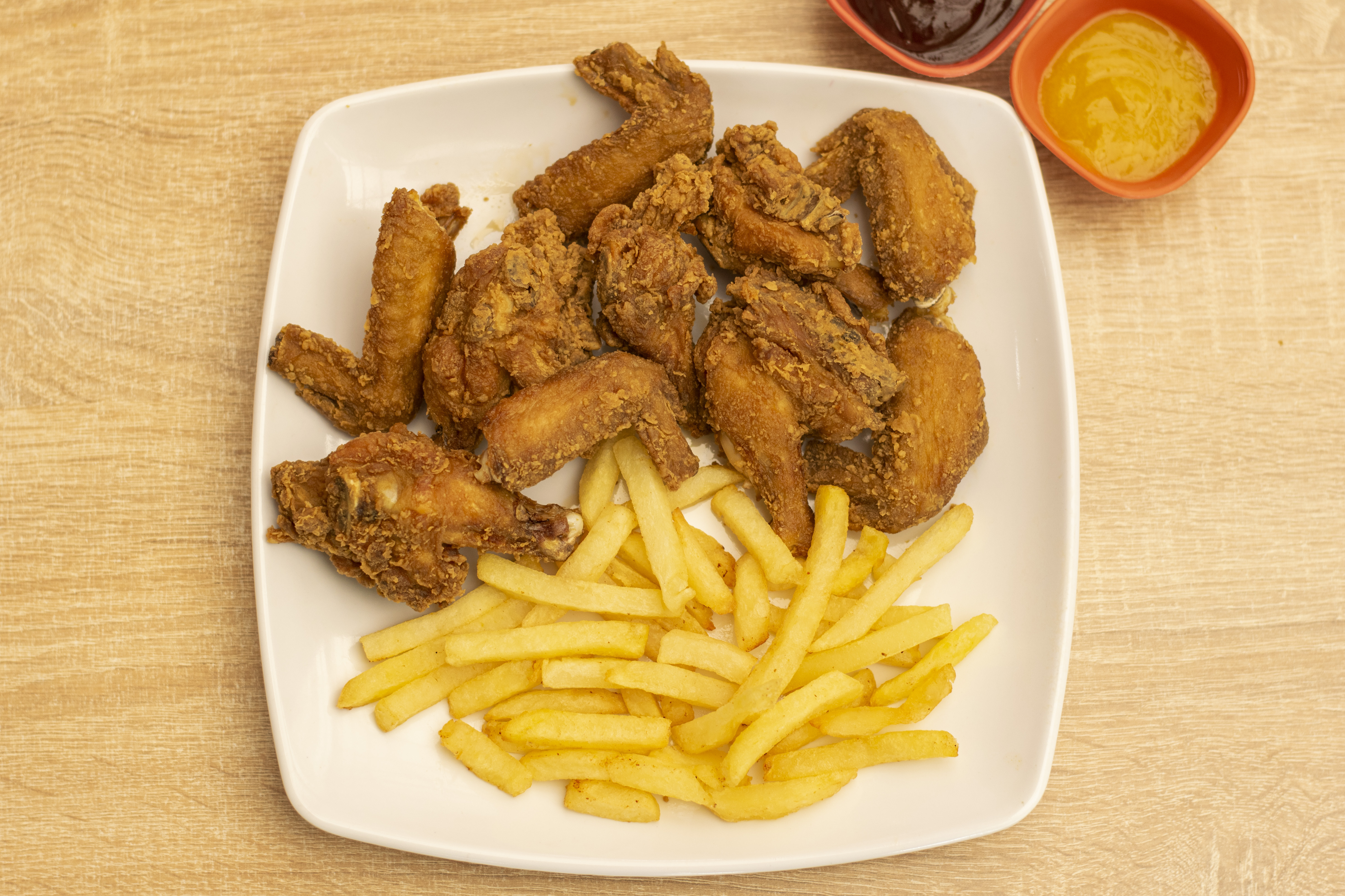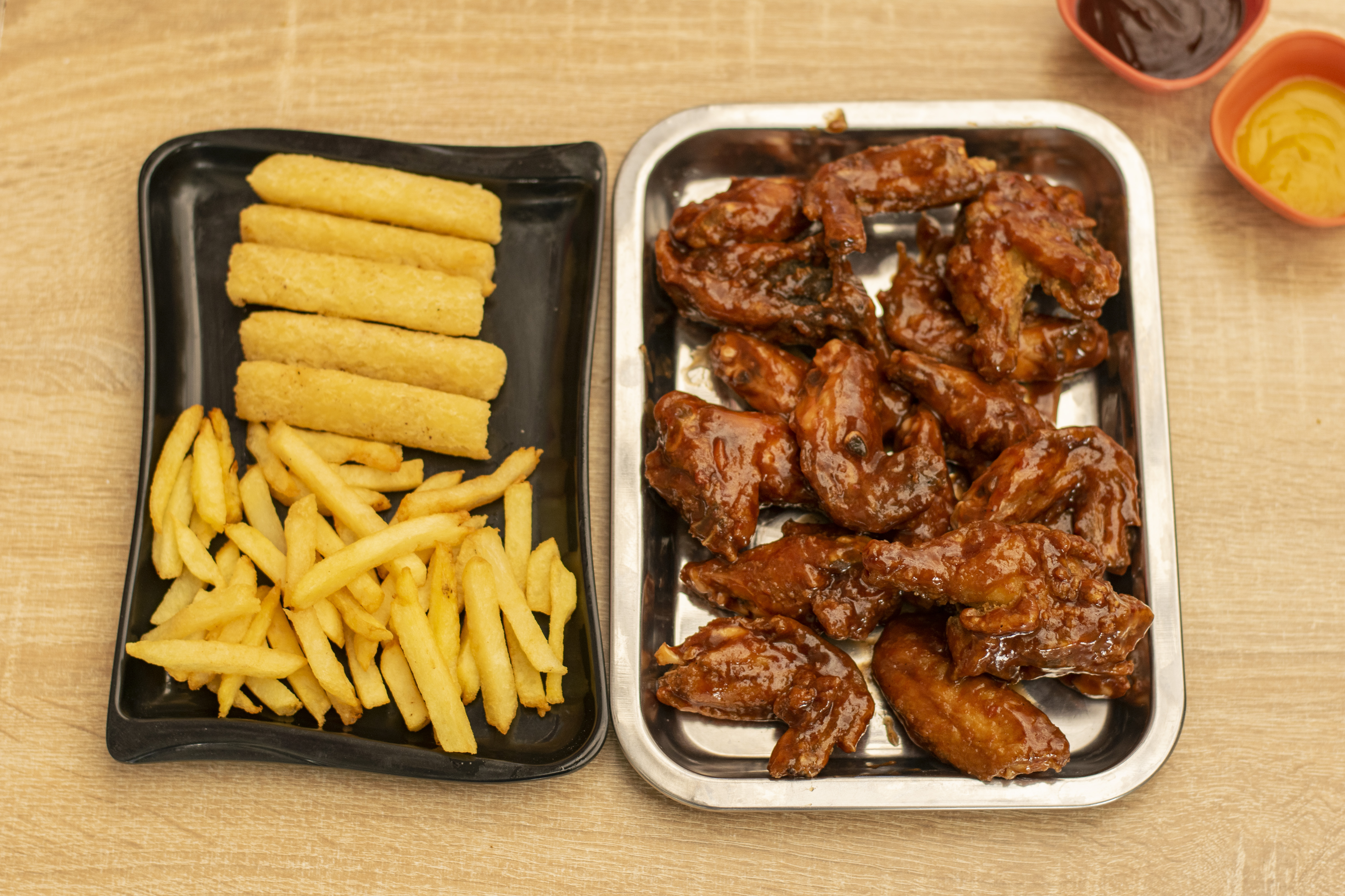 15 piezas de alitas, papa francesa 150 gr y 5 croquetas de yuca.