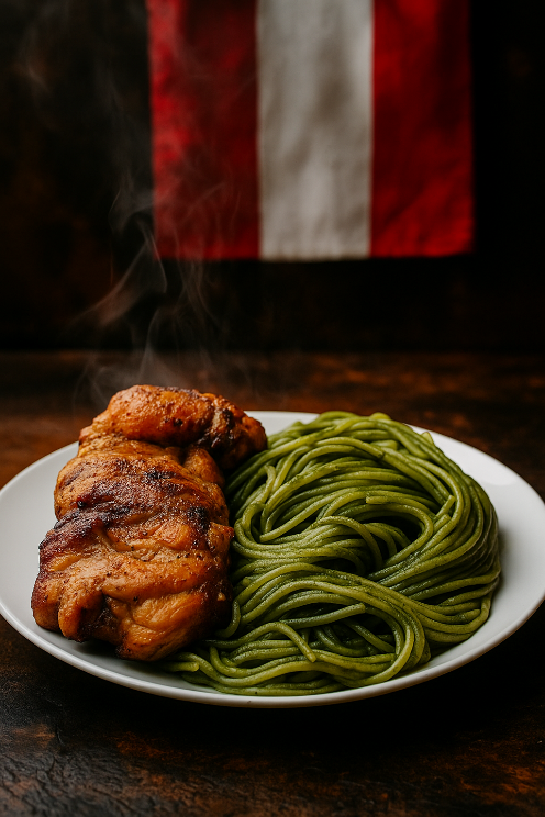 Tallarines en cremosa salsa de espinaca, albahaca, queso y ají amarillo acompañados de crujiente cerdo apanado.