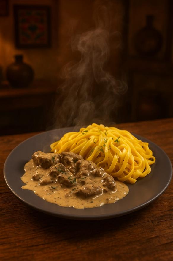 Lomo cremoso al estilo stroganoff con un toque de pimienta acompañado de tallarines en salsa huancaína con queso y ají amarillo.