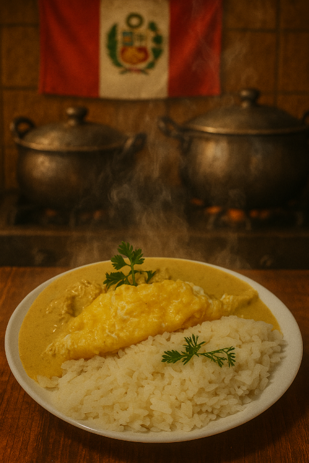 Pollo deshilachado en suave y cremosa salsa de ají amarillo con nueces acompañado de arroz blanco y huevo en tortilla.