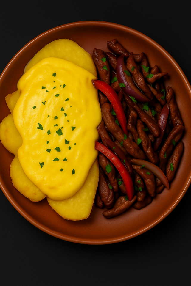 Papas cocidas bañadas en salsa huancaína servidas con el tradicional lomo saltado de la deliciosa cocina peruana.