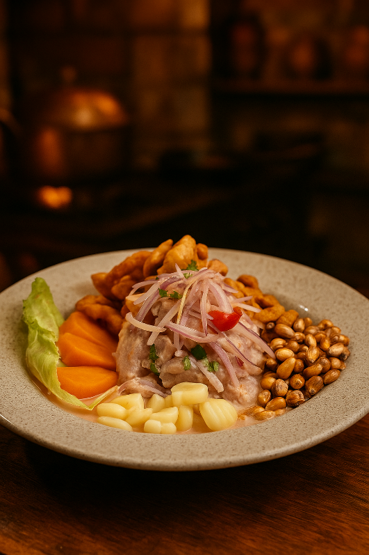 Fresquísimo pescado bañado en jugo de limón con cebolla morada crocante, ají que despierta el paladar y canchita dorada que te hará querer otra ronda.