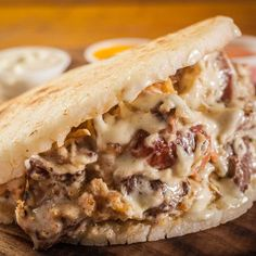 Deliciosa arepa rellena de pechuga desmechada, carne de res desmechada, jamón y queso.