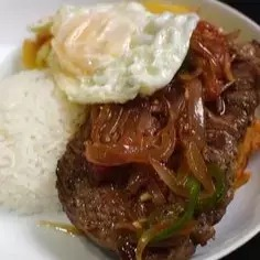 Bandeja con arroz, carne asada o carne en bistec y arepa