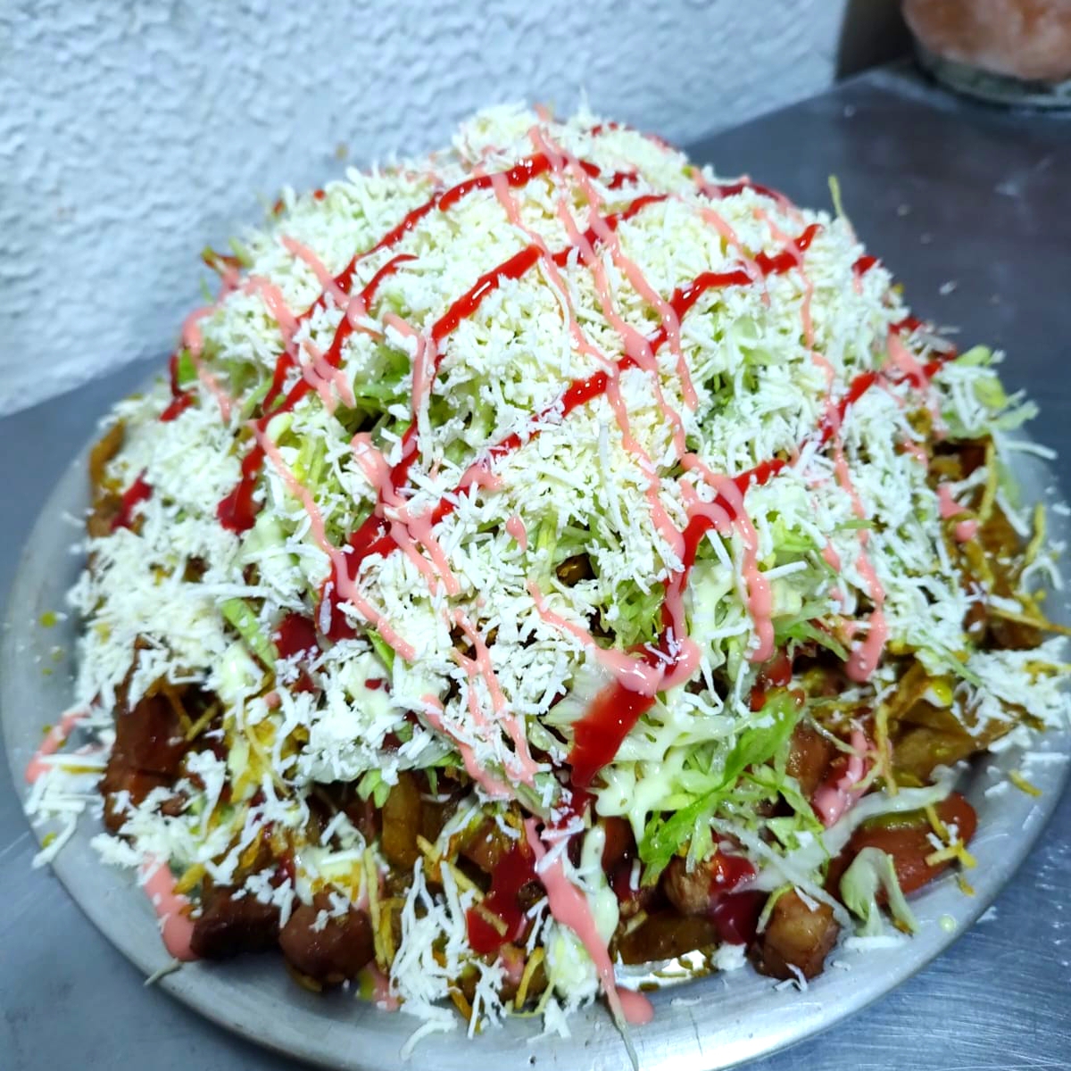 650 g de Papa a la francesa, dos salchichas americanas, maíz, tocineta, carne, chorizo, pollo, cerdo, lechuga, papitas y queso tajado. Máximo para 4 personas.