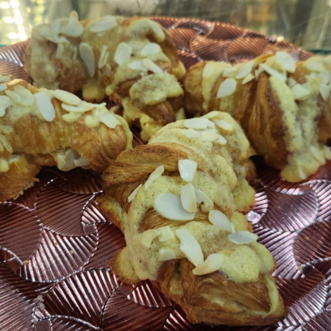 Delicioso croissant de mantequilla, relleno con crema y laminas de almendras, espolvoreado con azúcar pulverizada, precio por unidad