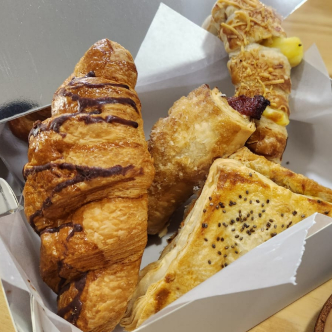 Canastilla de Hojaldres que incluye 1 croissant de chocolate, 1 palito de Queso, 1 pasaboca de bocadillo y 1 pastel de Pollo.