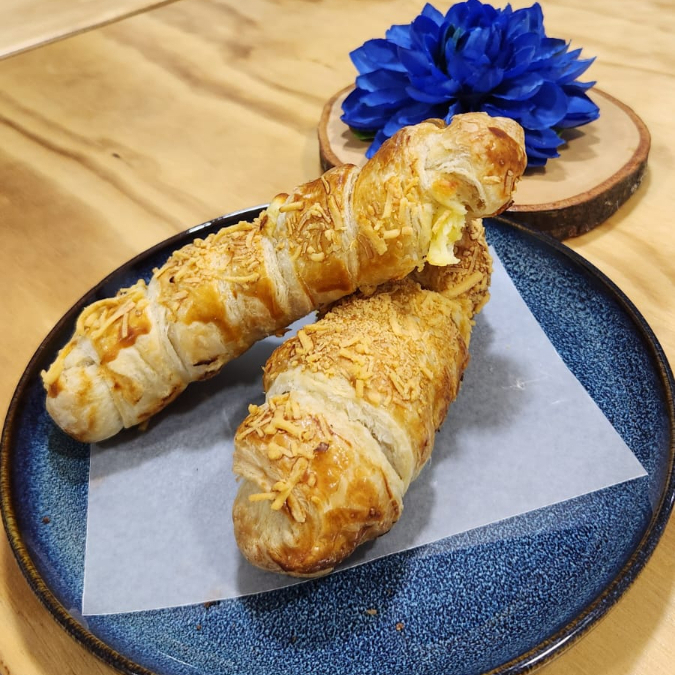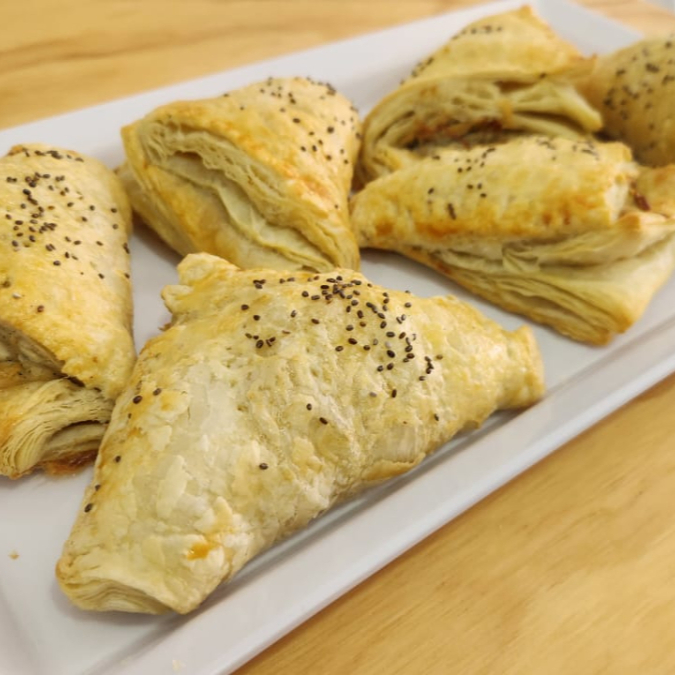 Hojaldre relleno de queso criollo, horneado con queso parmesano en su superficie. Precio unidad 80gr