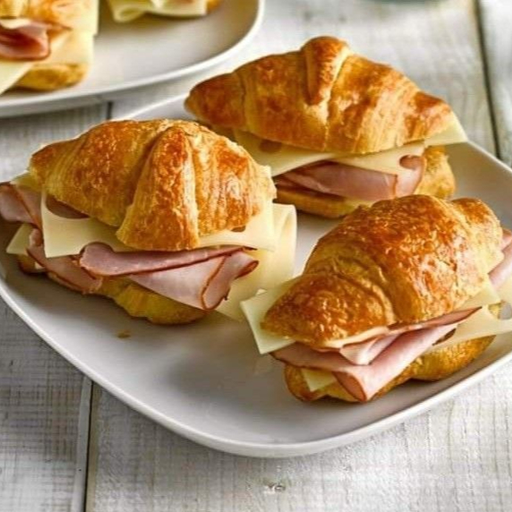 Croissant de mantequilla, con jamón, queso y salsa de mayo, pasado a la plancha. precio unidad.